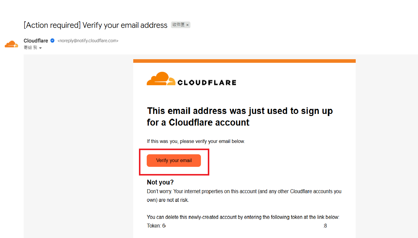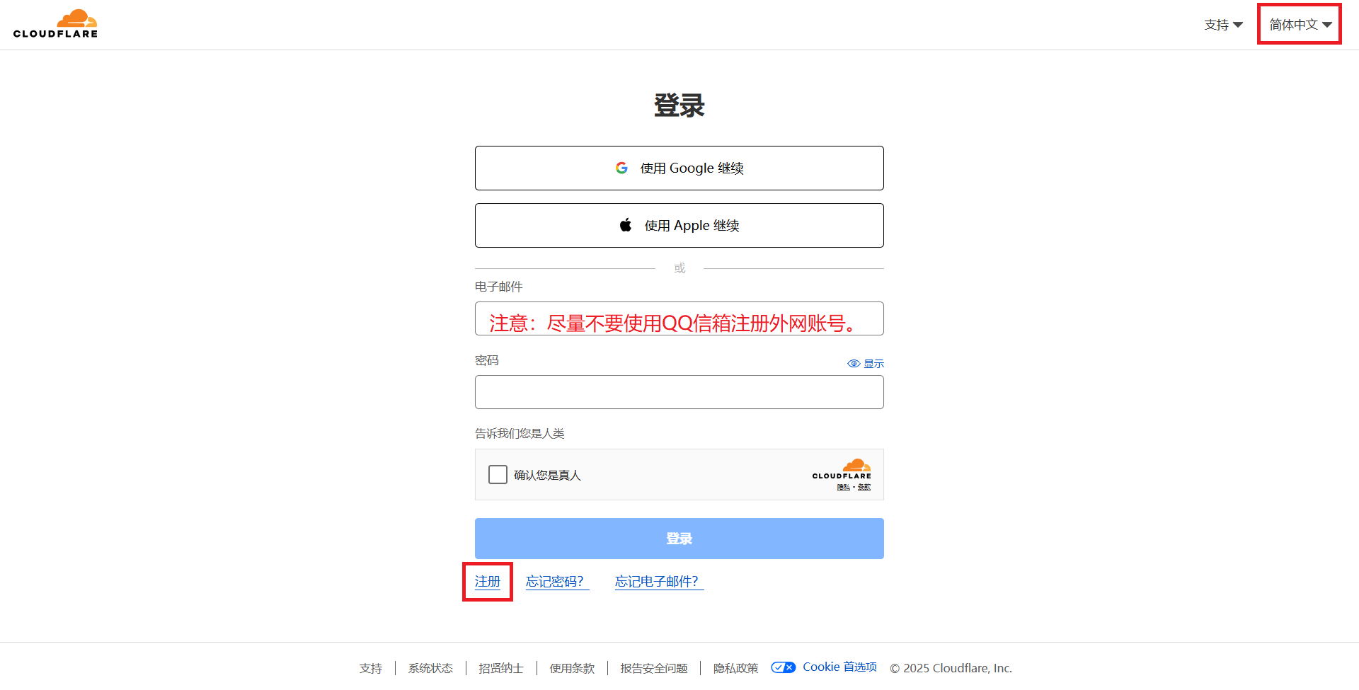 注册 Cloudflare 账号 By admin | 2025-07-03 注册 Cloudflare 账号 访问 Cloudflare 官网。切换语言为【简体中文】,点击【注册】。 填写箱地址、密码,注册。Cloudflare 会发送一封验证邮件到注册邮箱,点击邮件中链接完成验证。 使用注册的邮箱和密码完成登陆。