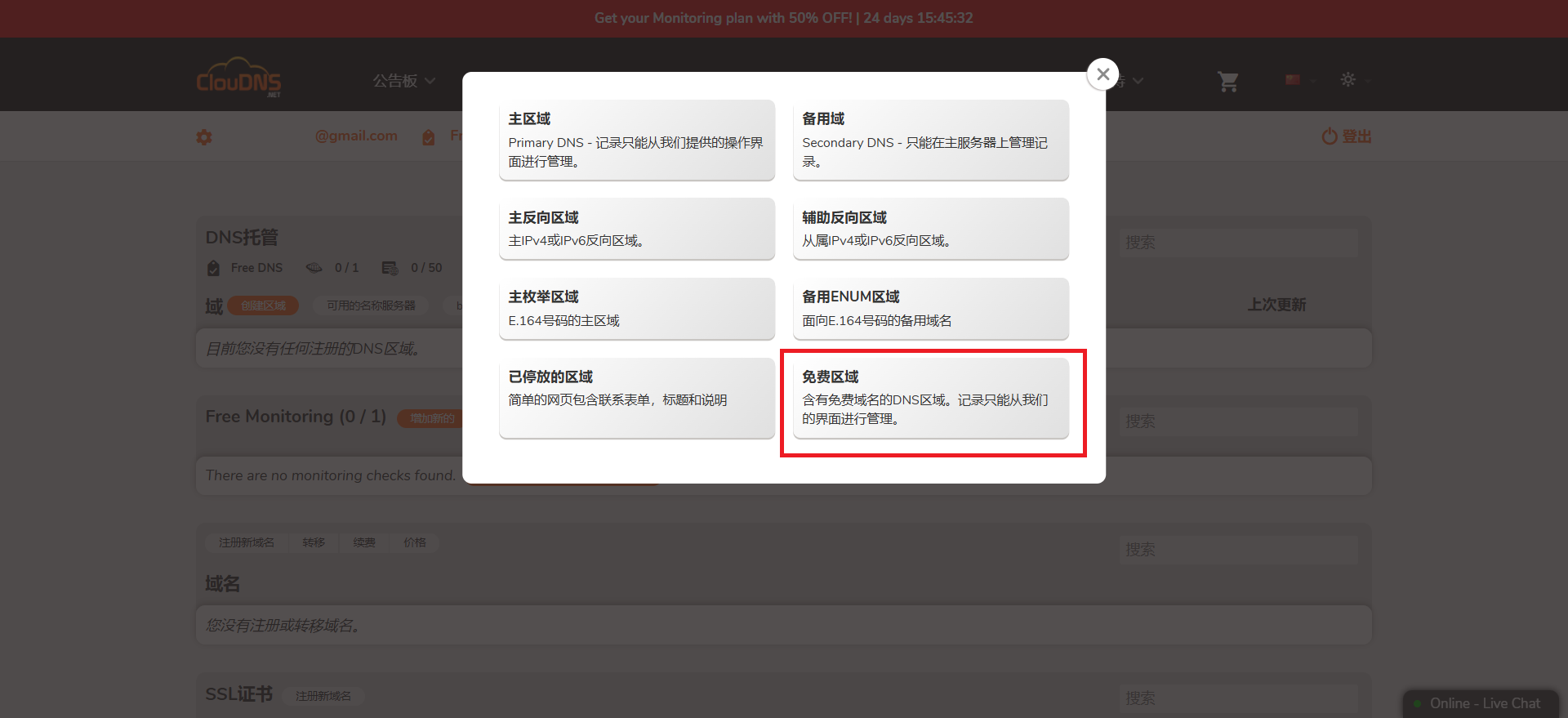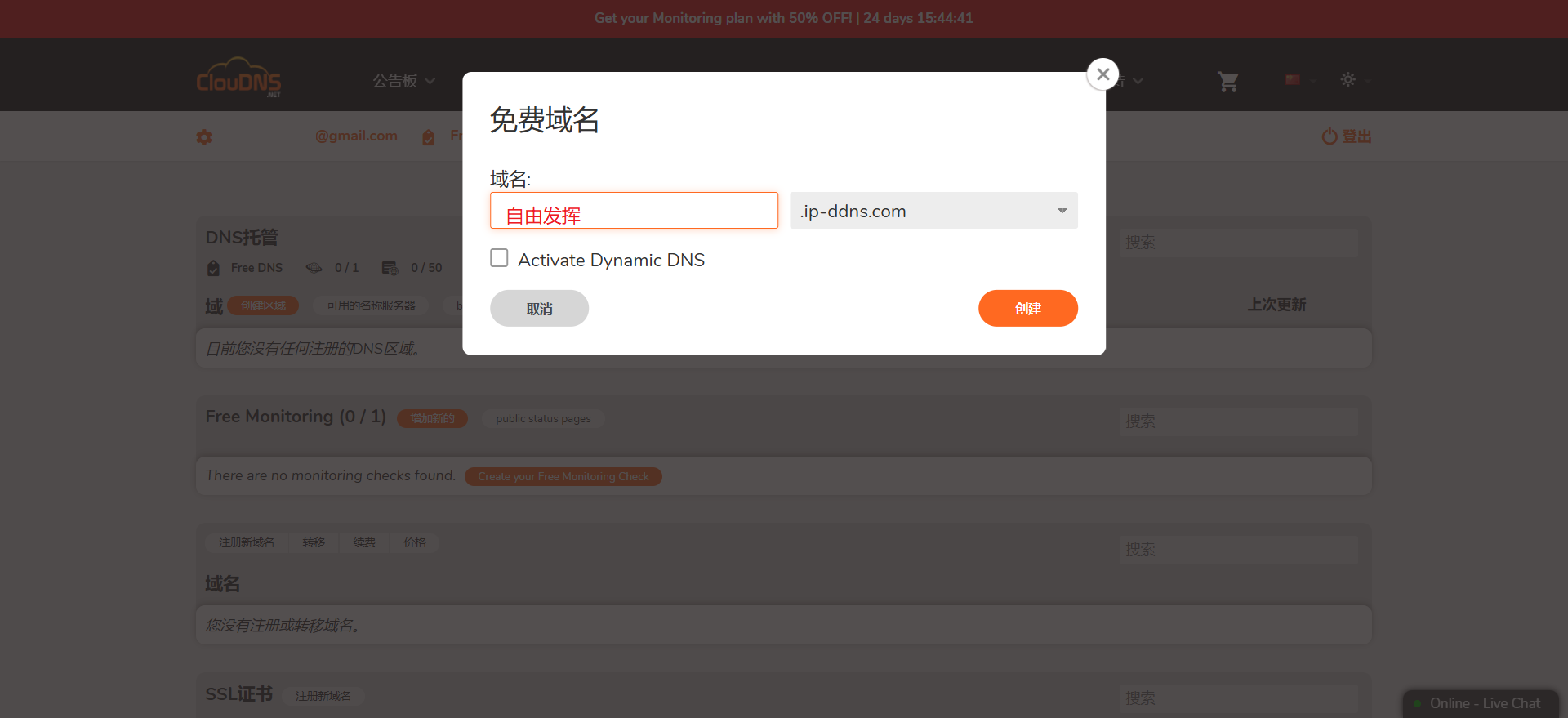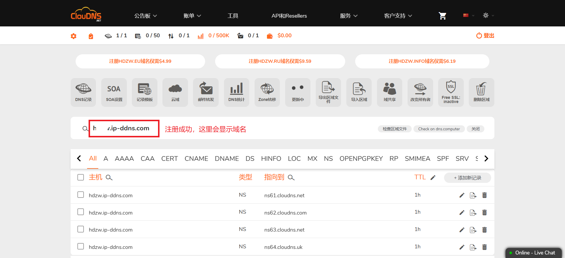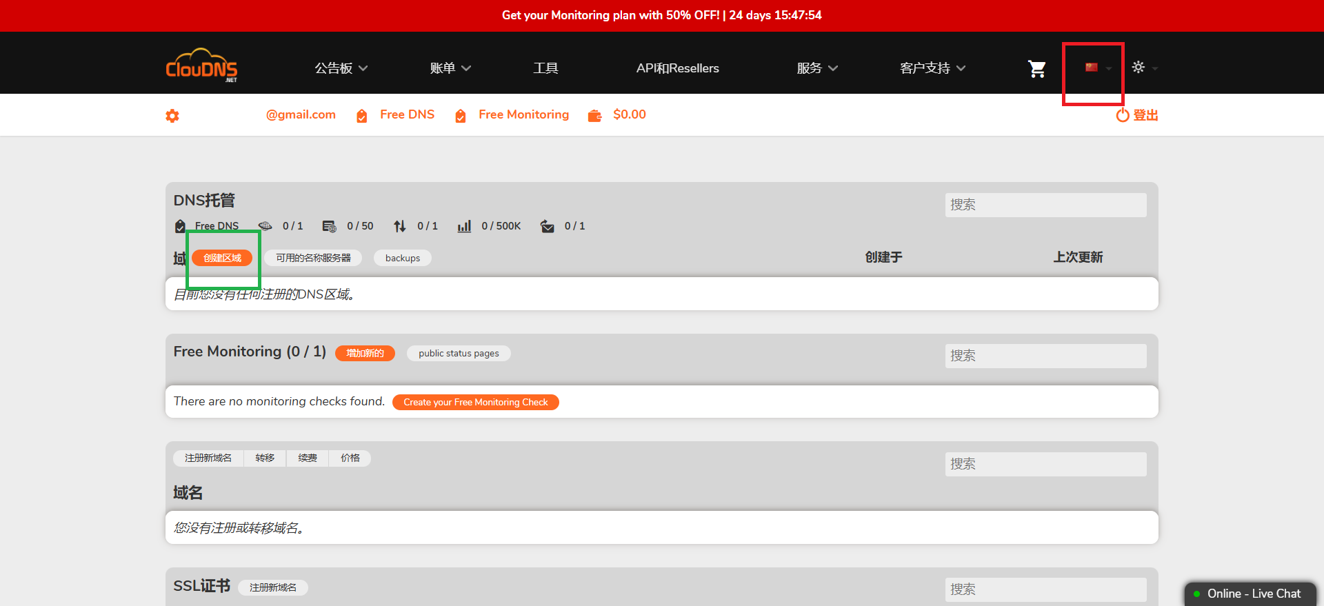 申请 ClouDNS 永久免费二级域名 By admin | 2025-07-02 申请 ClouDNS 永久免费二级域名 登陆 ClouDNS 平台。 将语言切换为【简体中文】,点击【创建区域】后选择【免费区域】。 自由发挥,填入域名前缀,原则上以简短好记为益。 注册成功来到配置面板,如红框所示,这里显示注册的域名。 备注: 根据申请时 IP 地址的不同,ClouDNS 分配的域名也会有所不同。