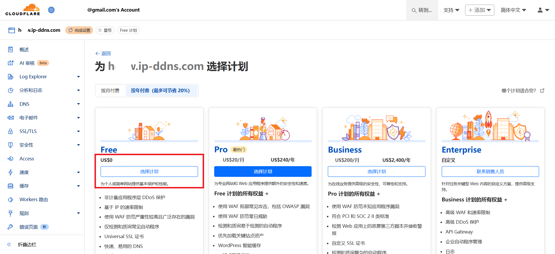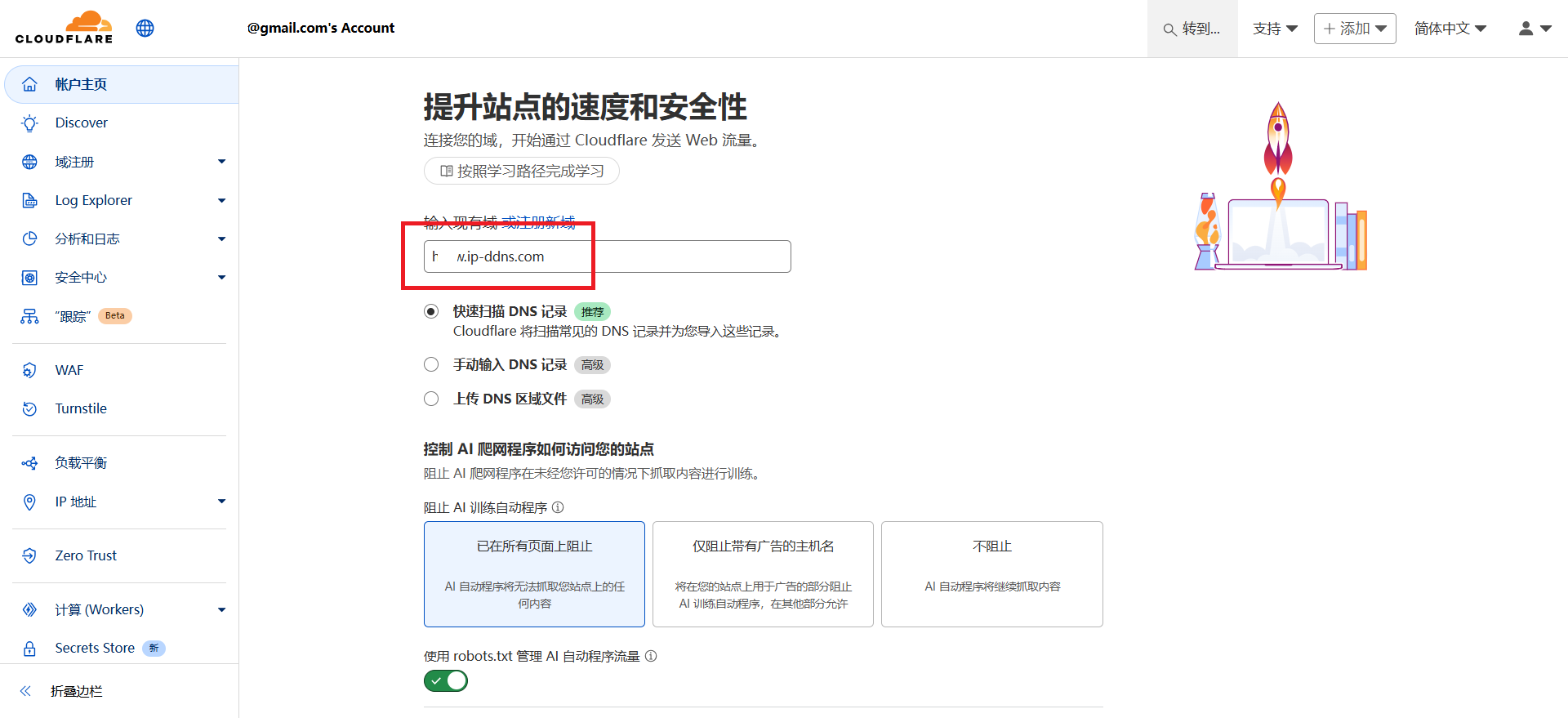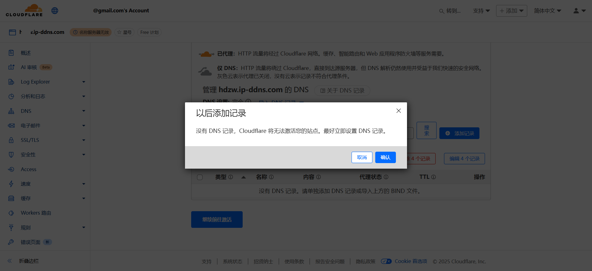 - 登陆 Cloudflare 账号,填入申请的 ClouDNS 二级域名,选择继续。