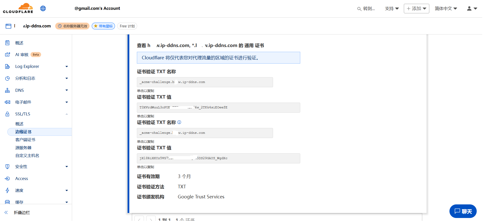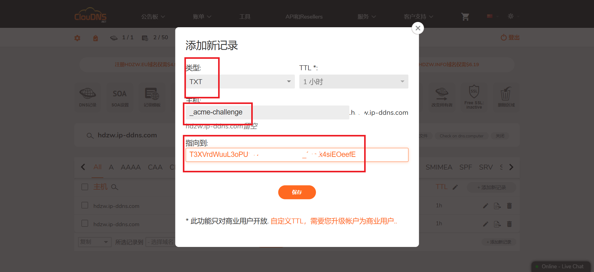- 回到 ClouDNS 继续【添加新记录】,类型选择【TXT】,主机复制验证信息的前段,如图所示,【指向到】则填入【证书验证TXT值】。