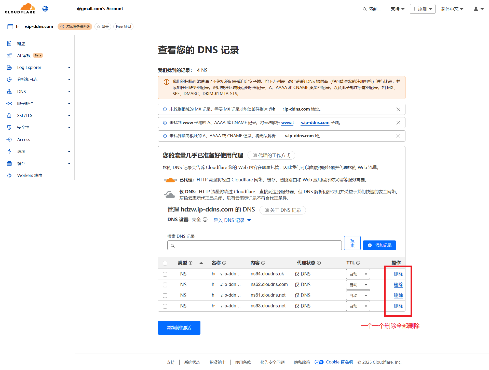 - Cloudflare 自动扫描相关信息,要把下方 DNS 服务器信息逐条删除,之后手动添加 Cloudflare 为我们分配的 DNS 服务器。
