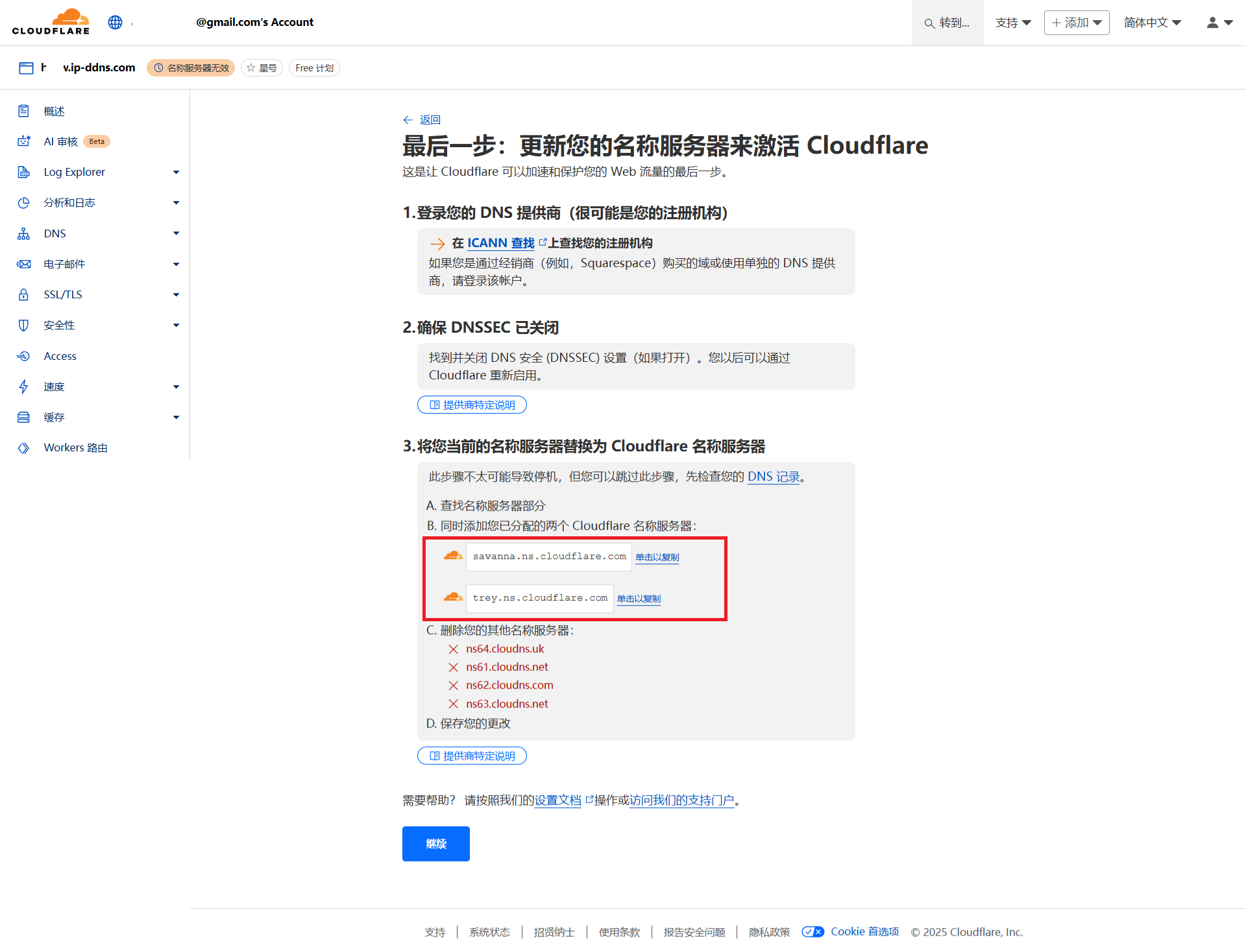 - 红框中显示的就是 Cloudflare 为我们的域名分配的 DNS 服务器。