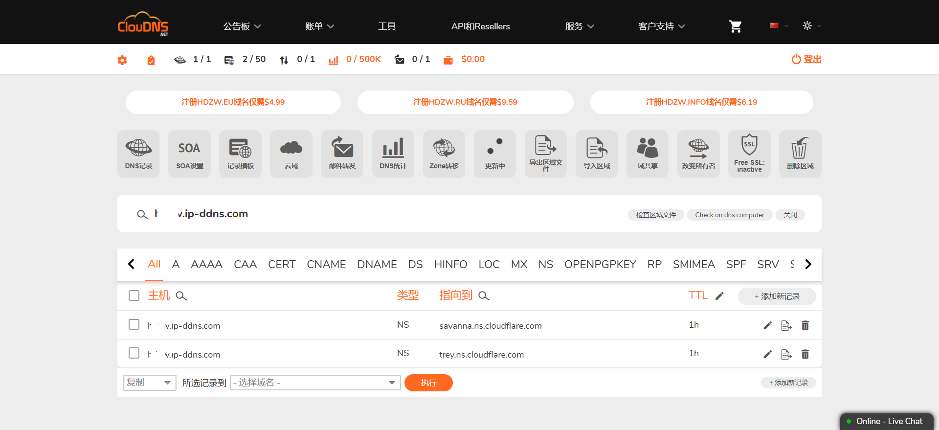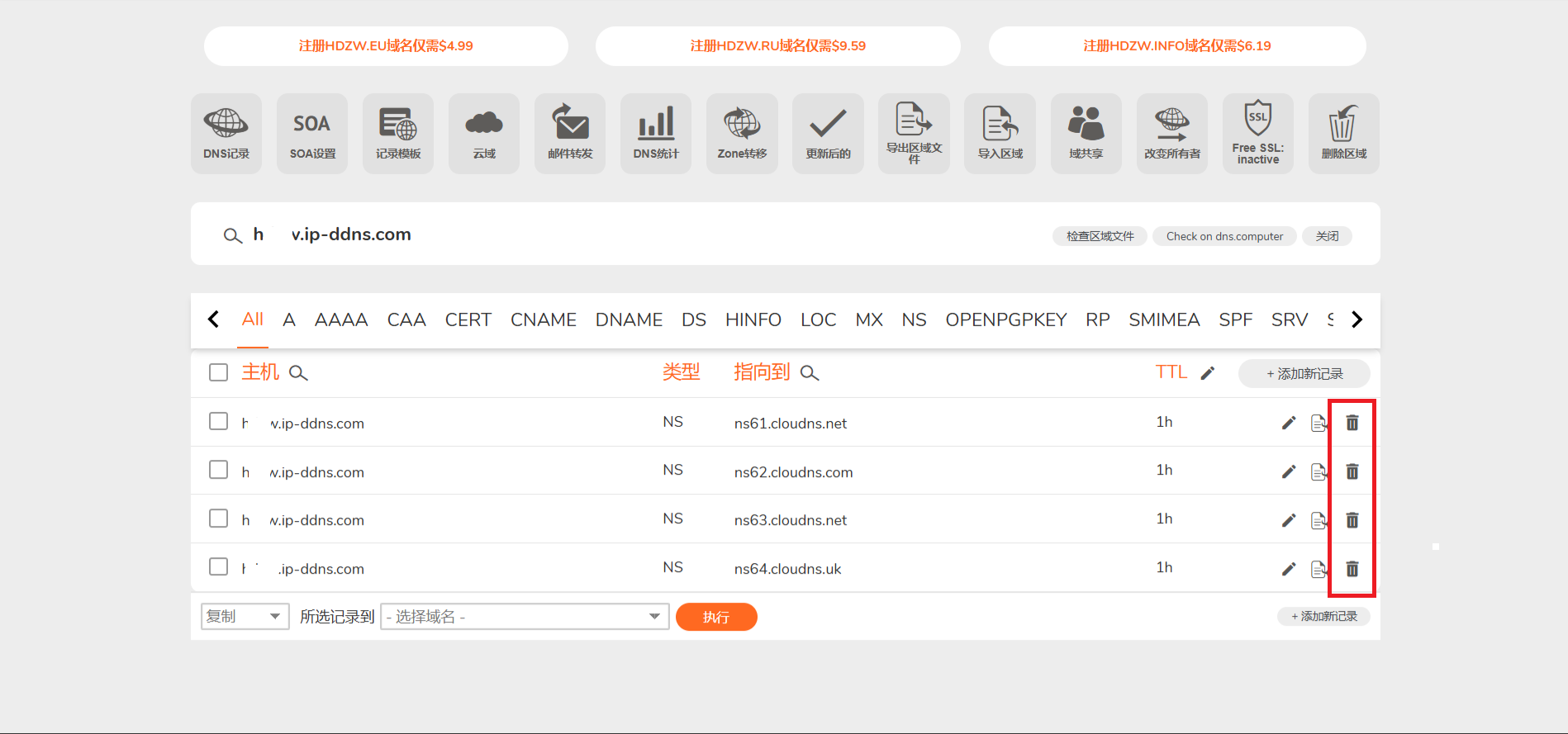 - 登陆 ClouDNS ,点击创建的二级域名来到配置页。同样删除 ClouDNS 分配的 DNS 服务器。