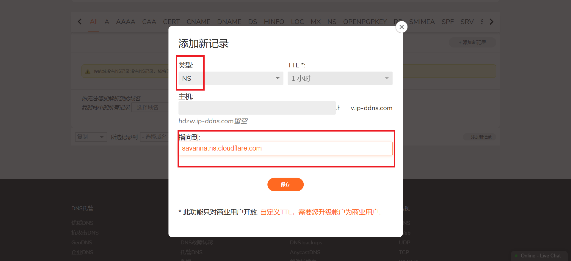 - 删除完成,点击【添加记录】。类型选择【NS】,主机留空,在【指向到】将 Cloudflare 分配的两条 DNS 服务器,分两次添加进来。
