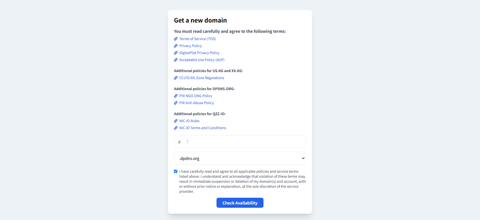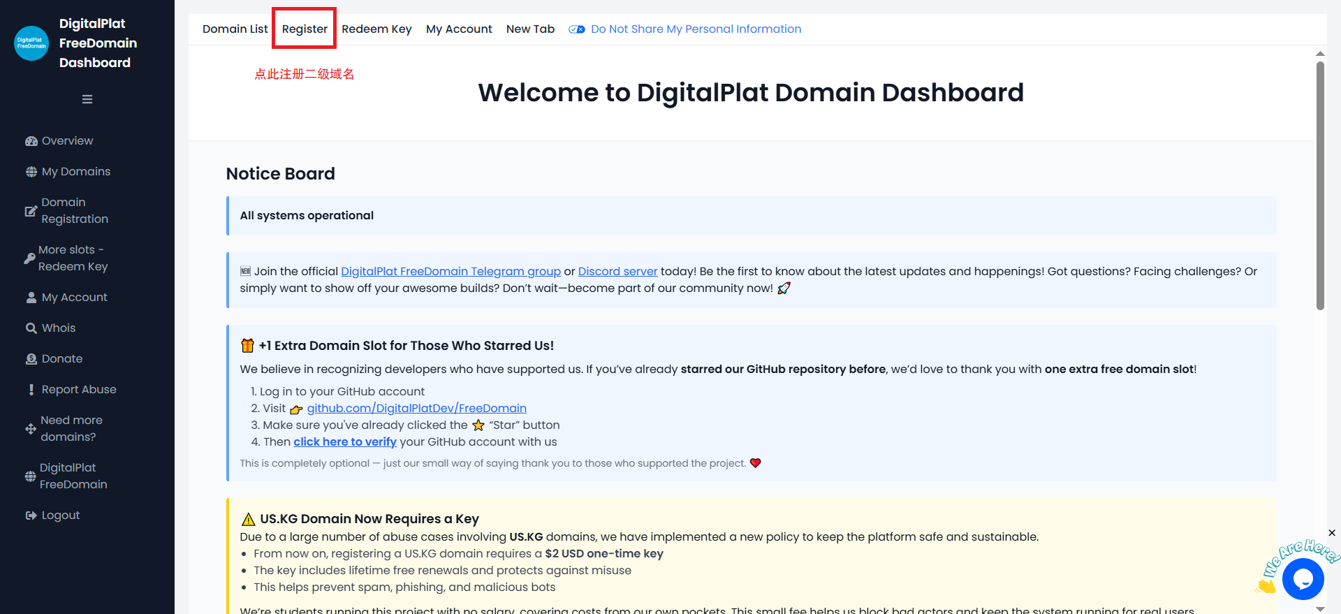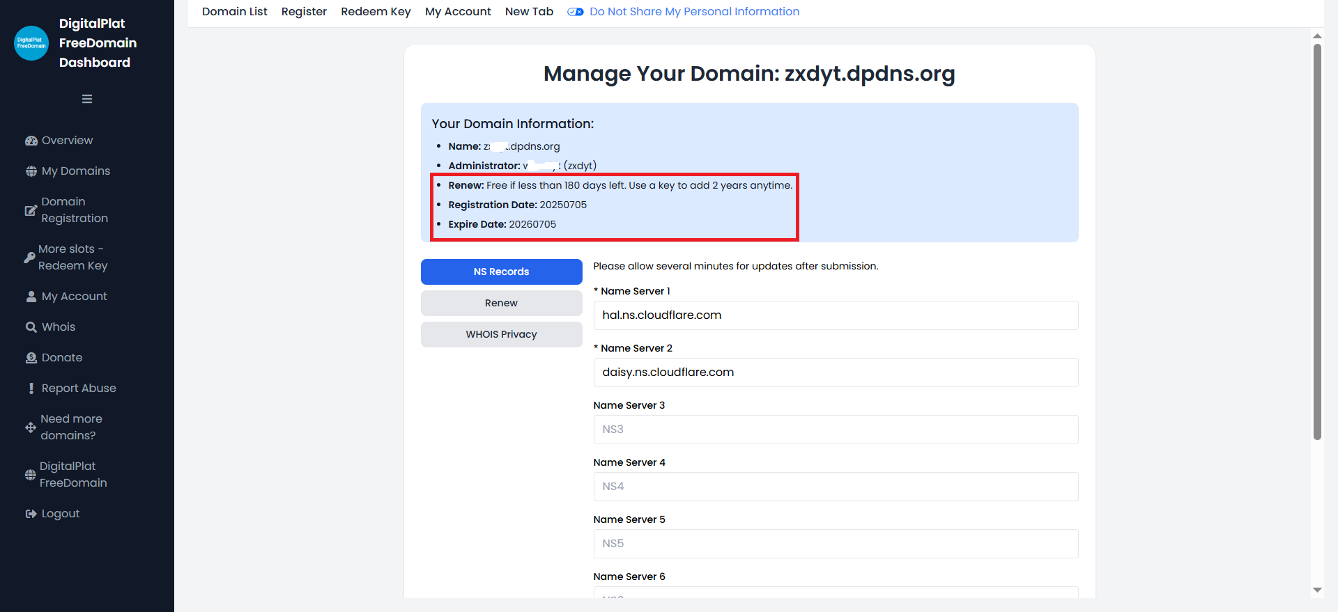 - DigitalPalt 提供的二级域名有效期为一年。在域名到期前的180天内,再次验证可以继续免费使用一年。依次类推,相当于永久免费。