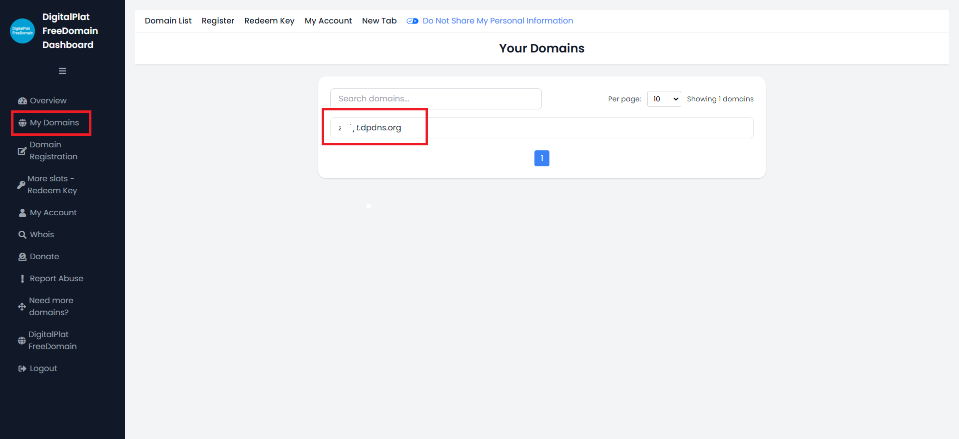 - 再次回到 DigitalPalt 首页,点击【My Domains】后选择右侧域名。