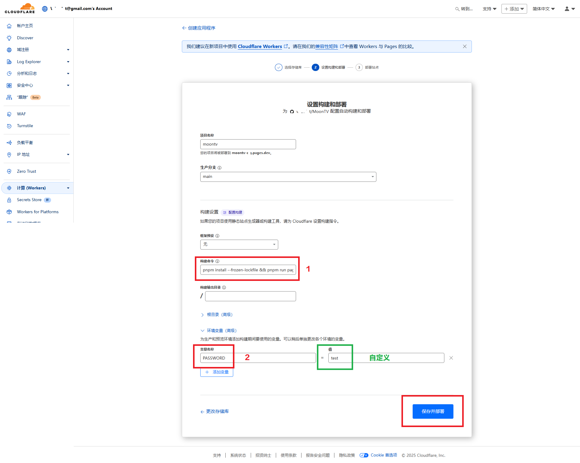 - 【项目名称】保持默认,【构建命令】填写 pnpm install —frozen-lockfile && pnpm run pages:build,点击【环境变量】在【变量名称】填写 PASSWORD ,【值】可以自定义,完成后点击【保存并部署】。
