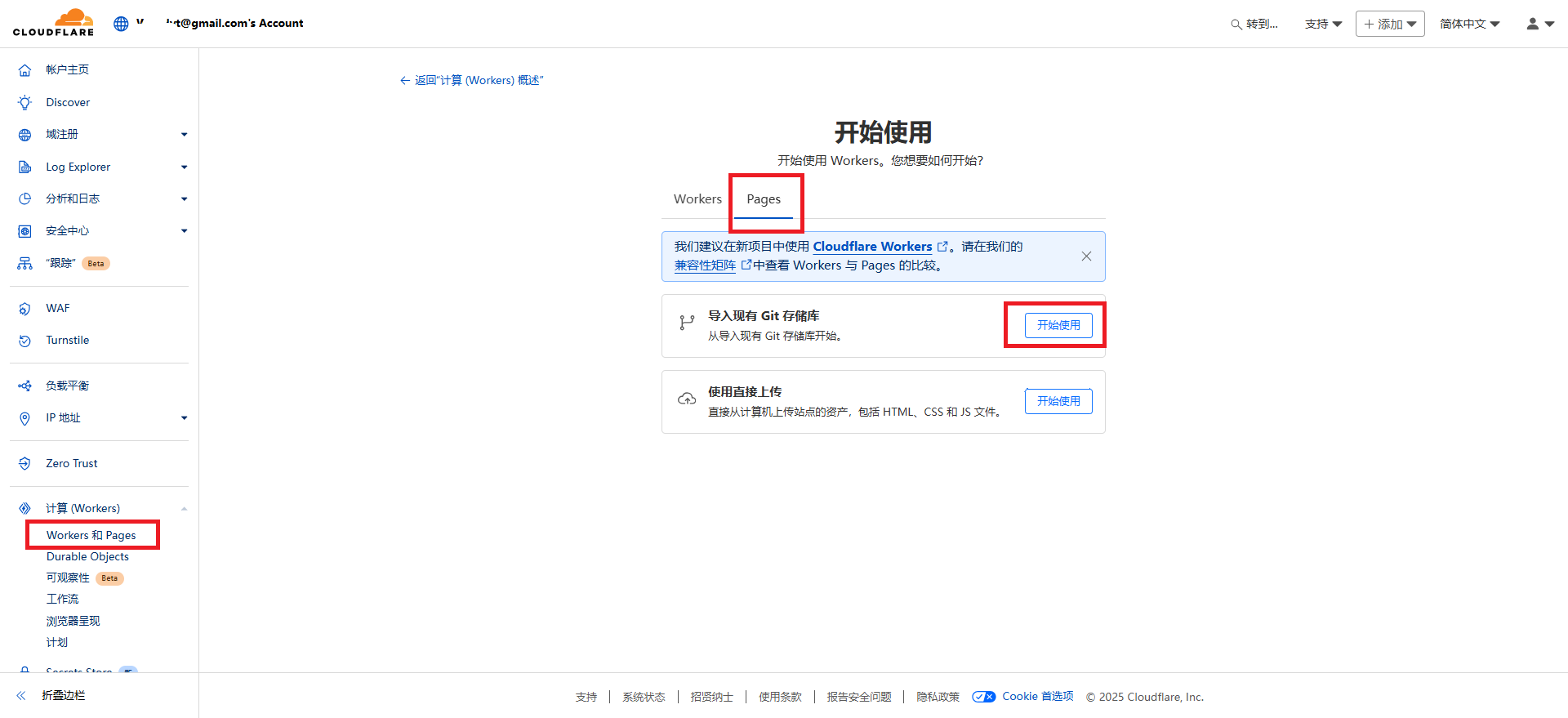 - 登陆 Cloudflare,找到【Workers 和 Pages】→【创建】→【Pages】→【导入现有 Git 存储库】→【开始使用】。