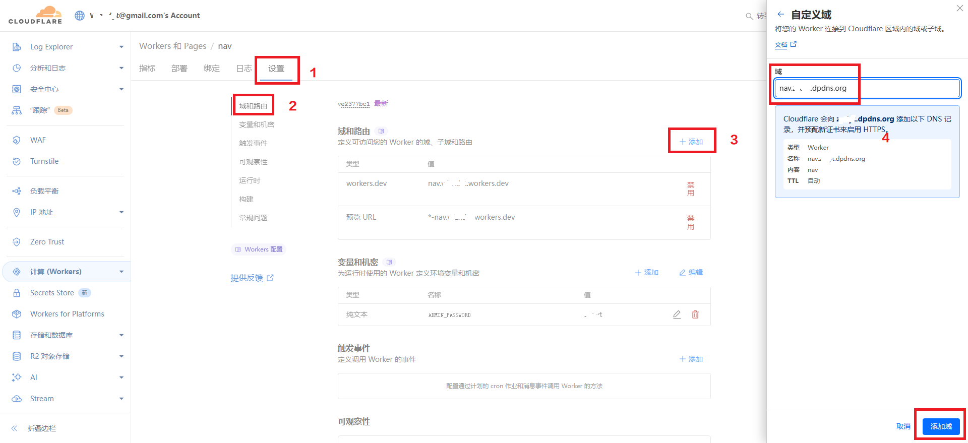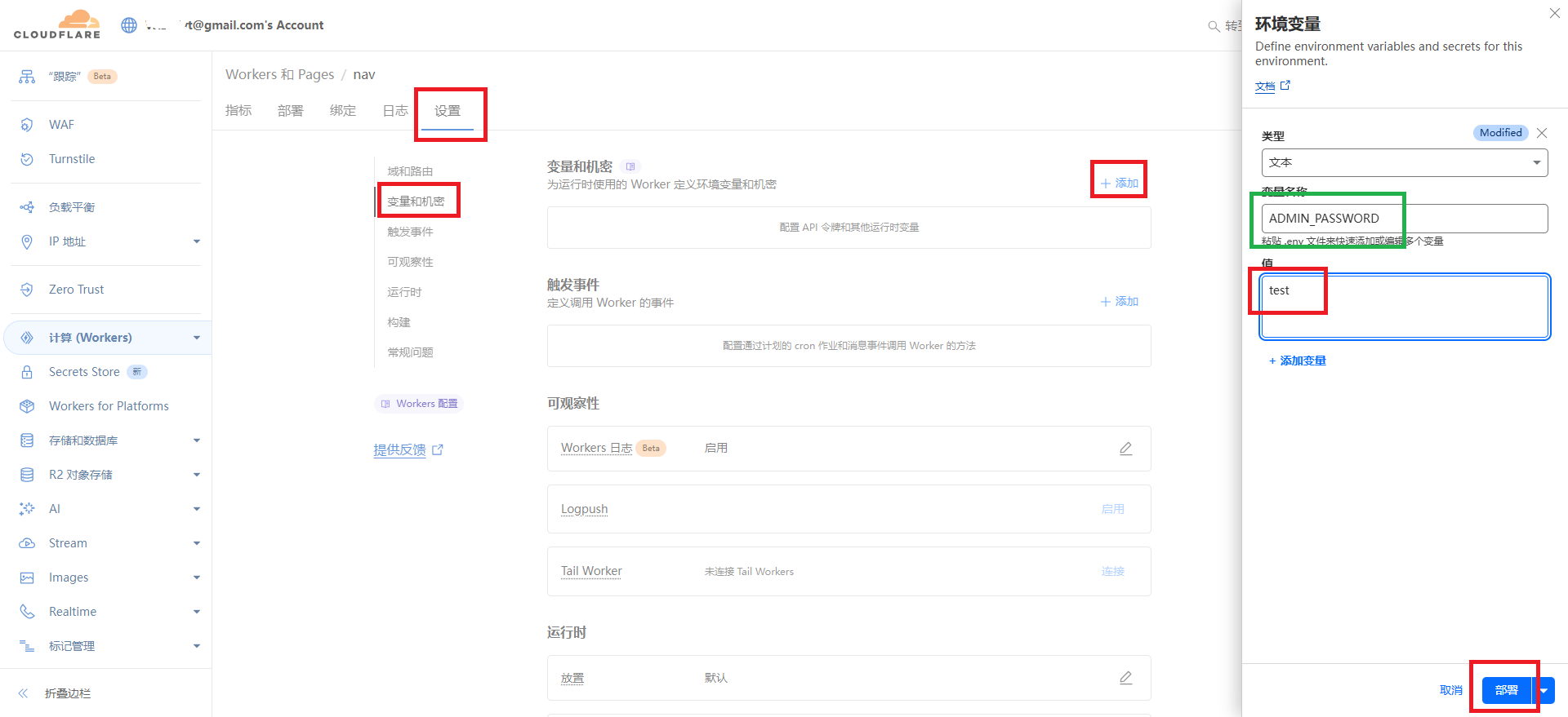 - 创建好 KV 空间后,点击【Workers 和 Pages】回到刚刚创建的项目。点击【设置】→【变量和机密】→【添加】→【变量名称】填入 ADMIN_PASSWORD ,【值】自定义。