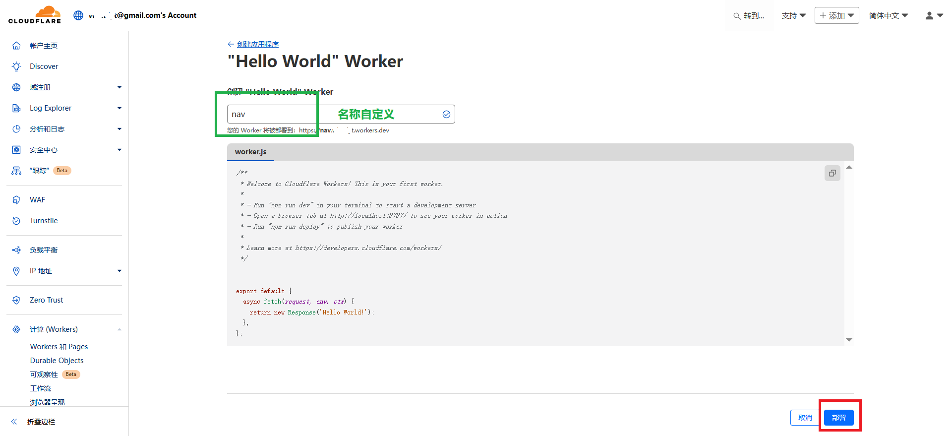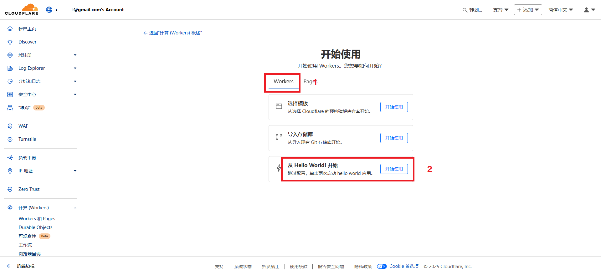 - 登陆 Cloudflare 打开【workers 和 Pages】→【创建】→【从 Hello World! 开始】→【开始使用】。