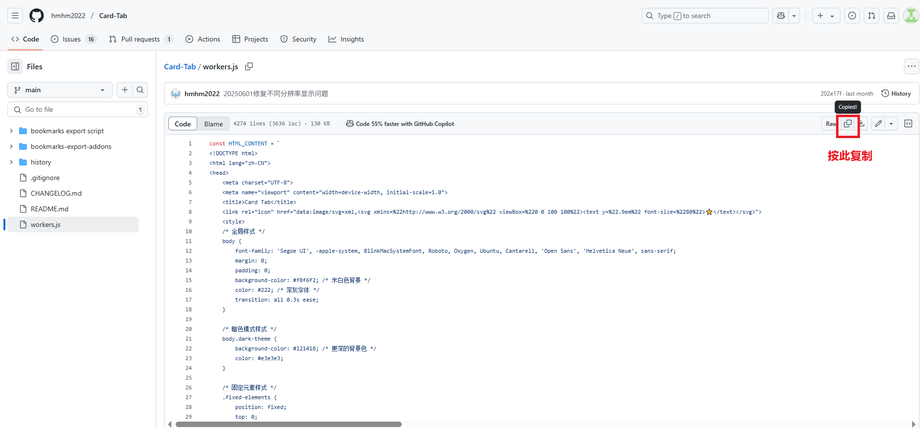 - 回到 Github 项目页,找到 workers.js 文件,打开并复制里面全部内容。(按下图标当显示 Copied! 时,代表复制成功)