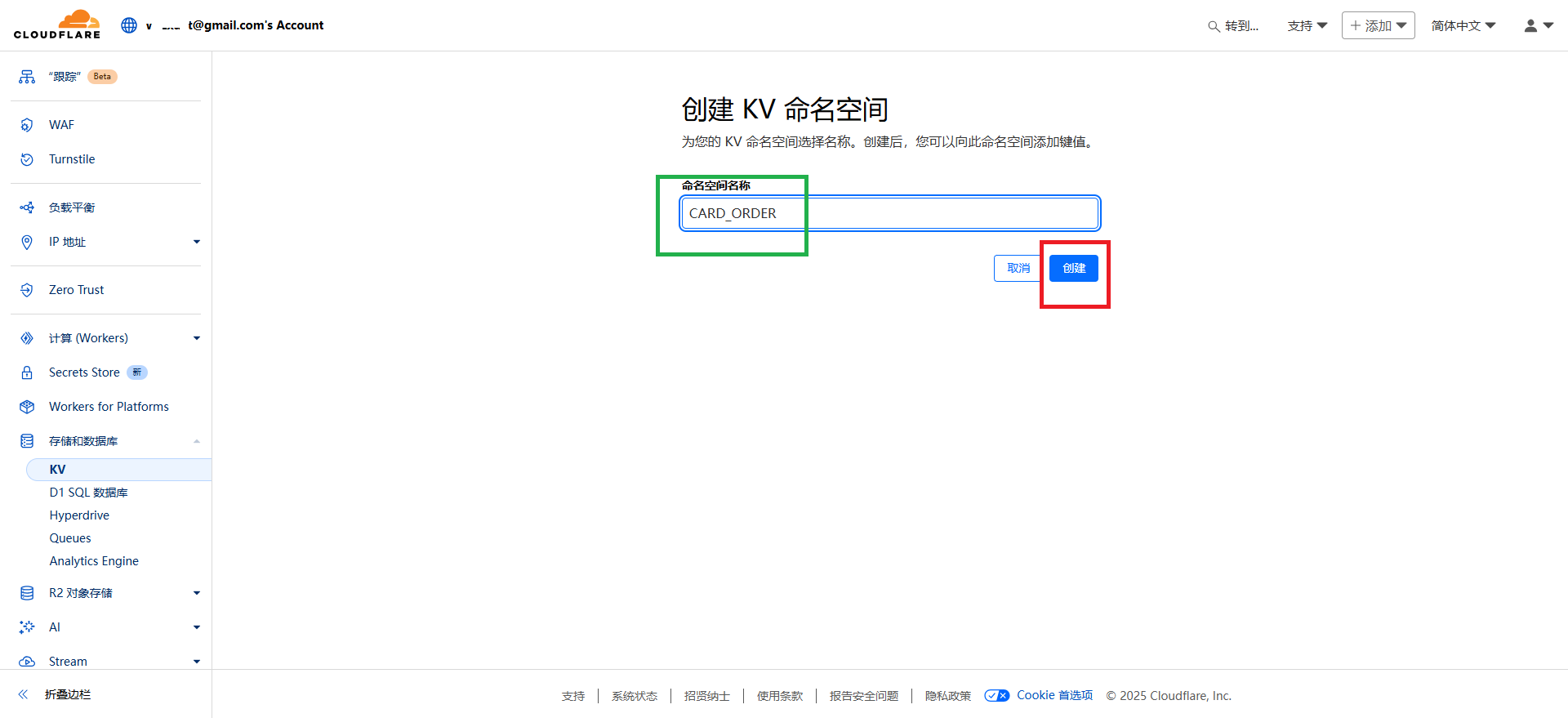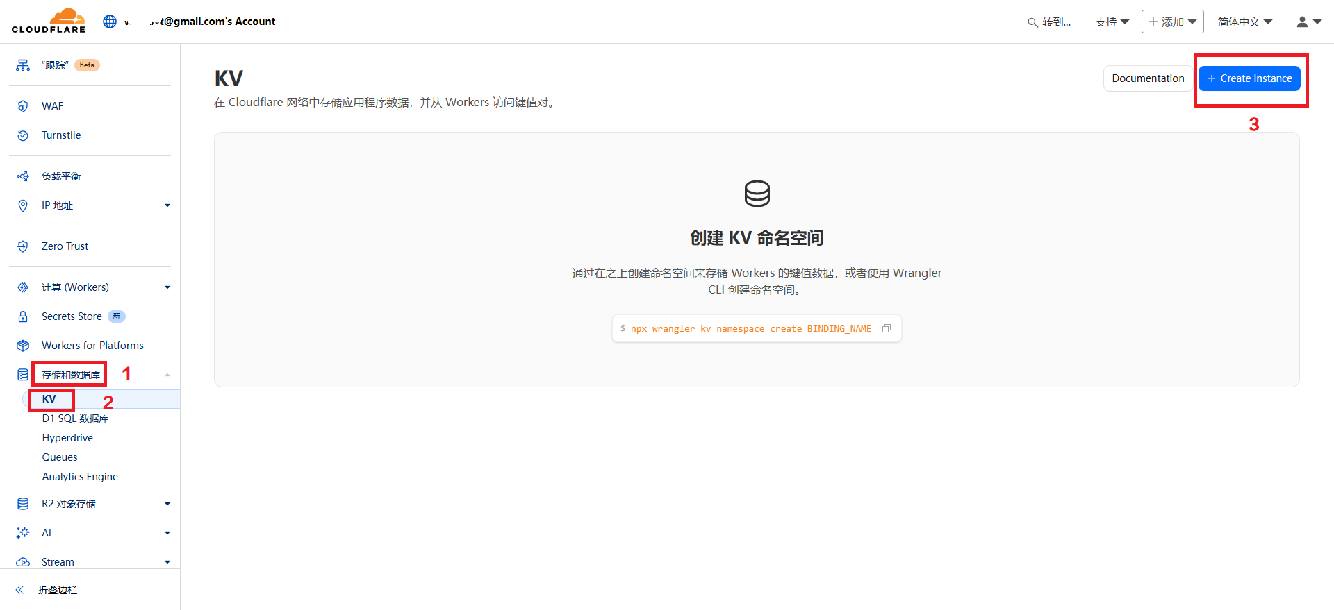- 接下来回到 Cloudflare 面板,找到【存储和数据库】→【KV】→【Create Instnace】