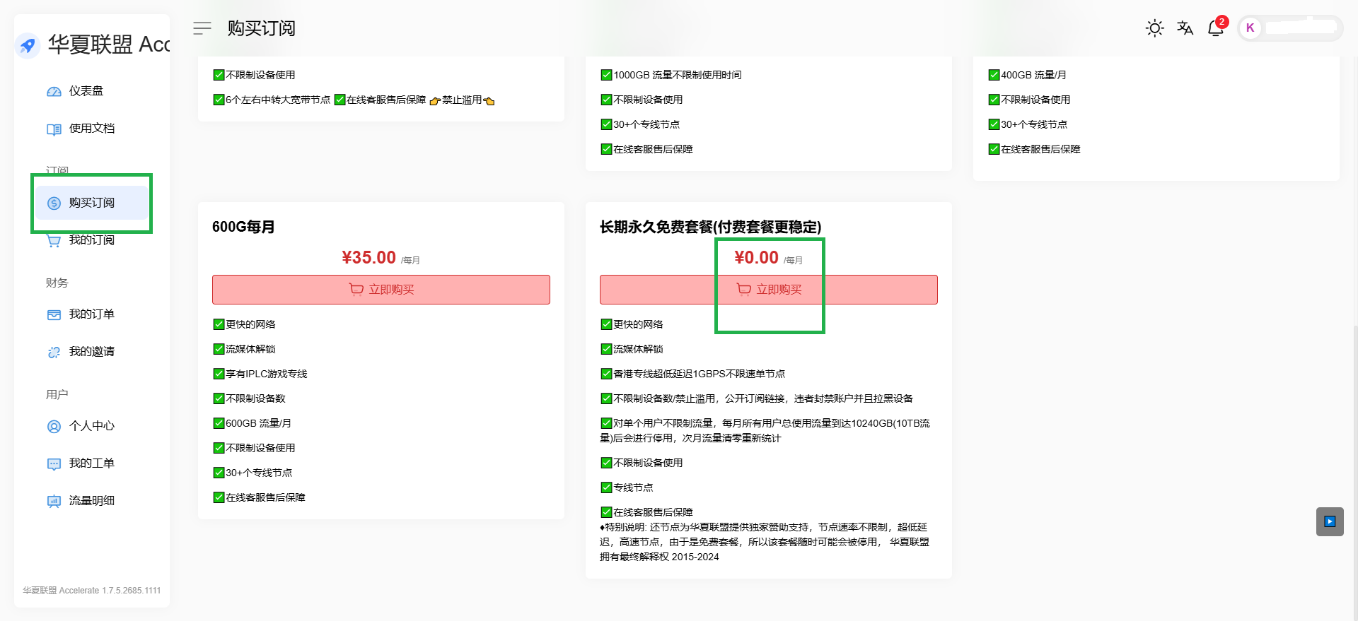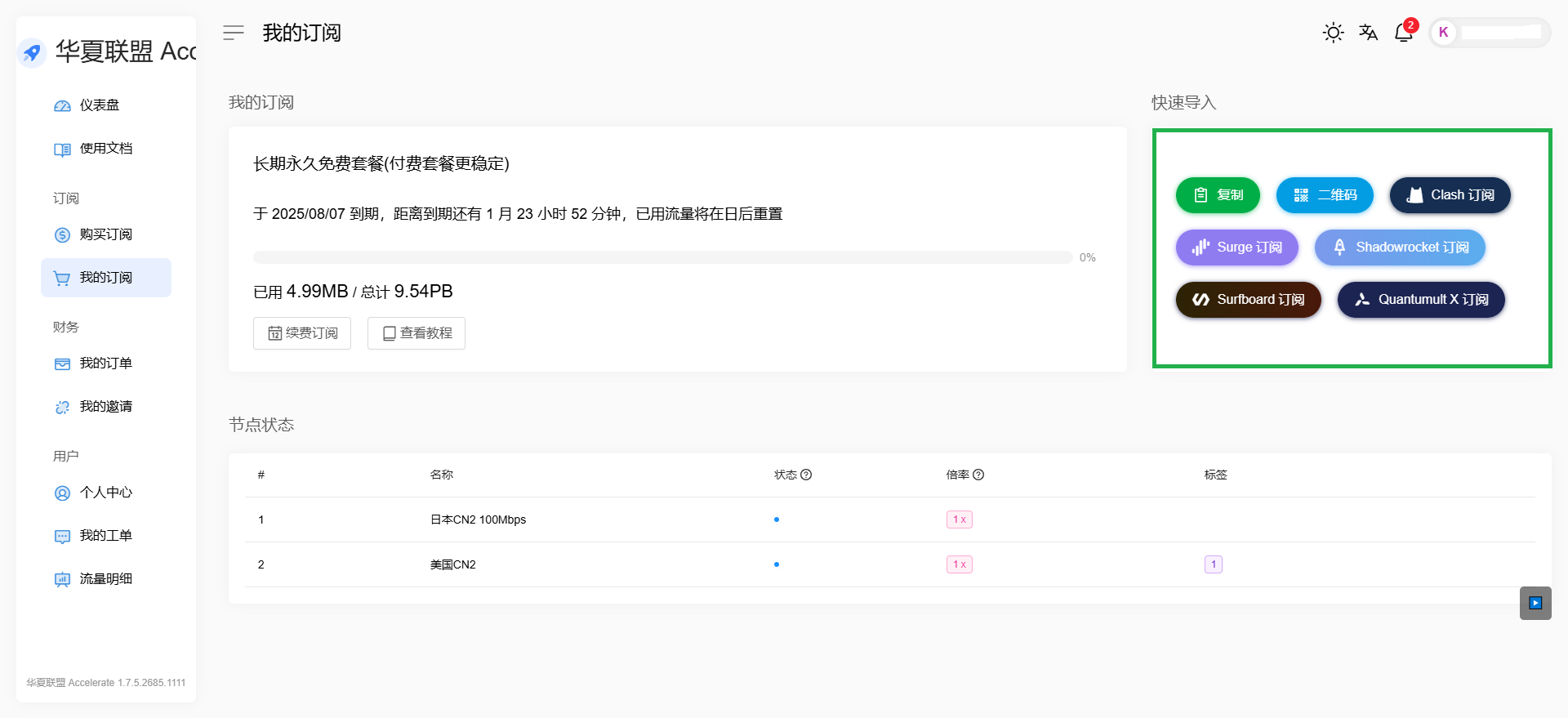 公益机场 By admin | 2025-07-13 公益机场 华夏联盟除提供收费套餐外,还提供【长期永久免费的套餐】的共享方案,所有注册用户每月共享 10TB 免费流量,次月往复。虽然节点不多但胜在比较干净,防失联也是不错的选择。 注册帐号需要邮箱验证。 【购买订阅】→【长期永久免费套餐】→【立即购买】 【我的订阅】→【快速导入】→【复制】 备注: 国内禁止分享节点,这里仅做记录。