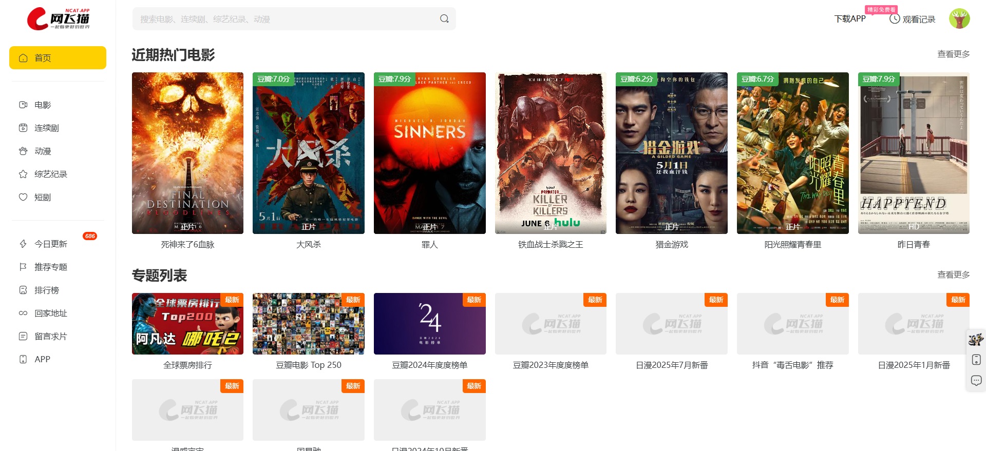网飞猫 By admin | 2025-07-20 网飞猫一级棒的在线影视平台,提供了丰富的国内外资源,包括奈飞等国际平台的资源内容全部免费提供。 网飞猫官网 网飞猫不但网页端资源丰富,还提供了手机和电视支持。通过下载安装 app 并登陆手机端,扫描电视端进行绑定后,在手机上完成签到就能在电视端调用更多高清资源。非常的 Nice ! 手机端内置有成人内容,好在可以手动关闭。