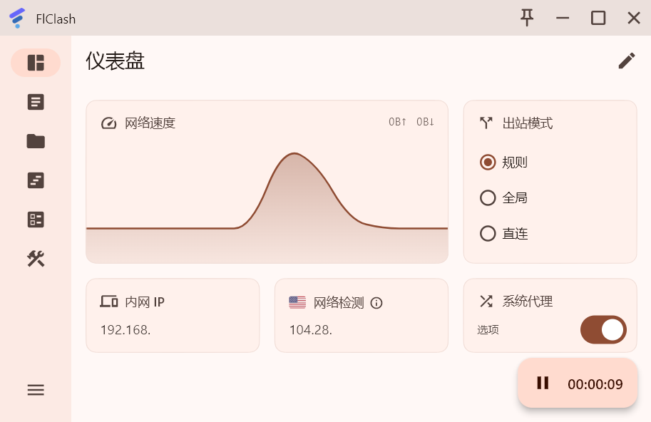 仪表盘界面,使用右下角图标开启关闭,连接正常会显示落地 IP 地址。
