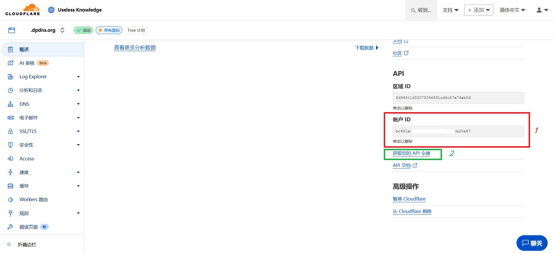 - 获取账户 ID :【Cloudflare 帐户主页】→【域名】→【帐户 ID】