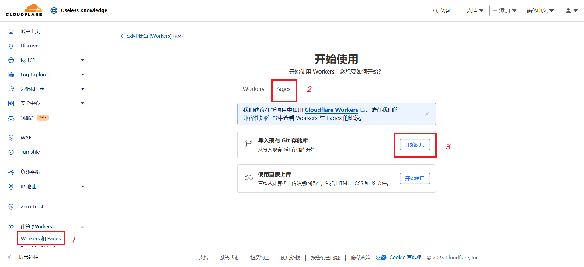 - 【Workers 和 Pages】→【创建】→【Pages】→【导入现有 Git 存储库】→【Sink】→【开始设置】。