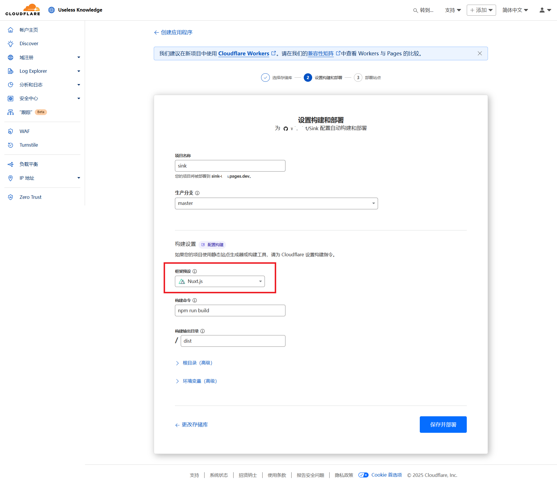 - 【框架预设】选择【Nuxt.js】→【保存并部署】。