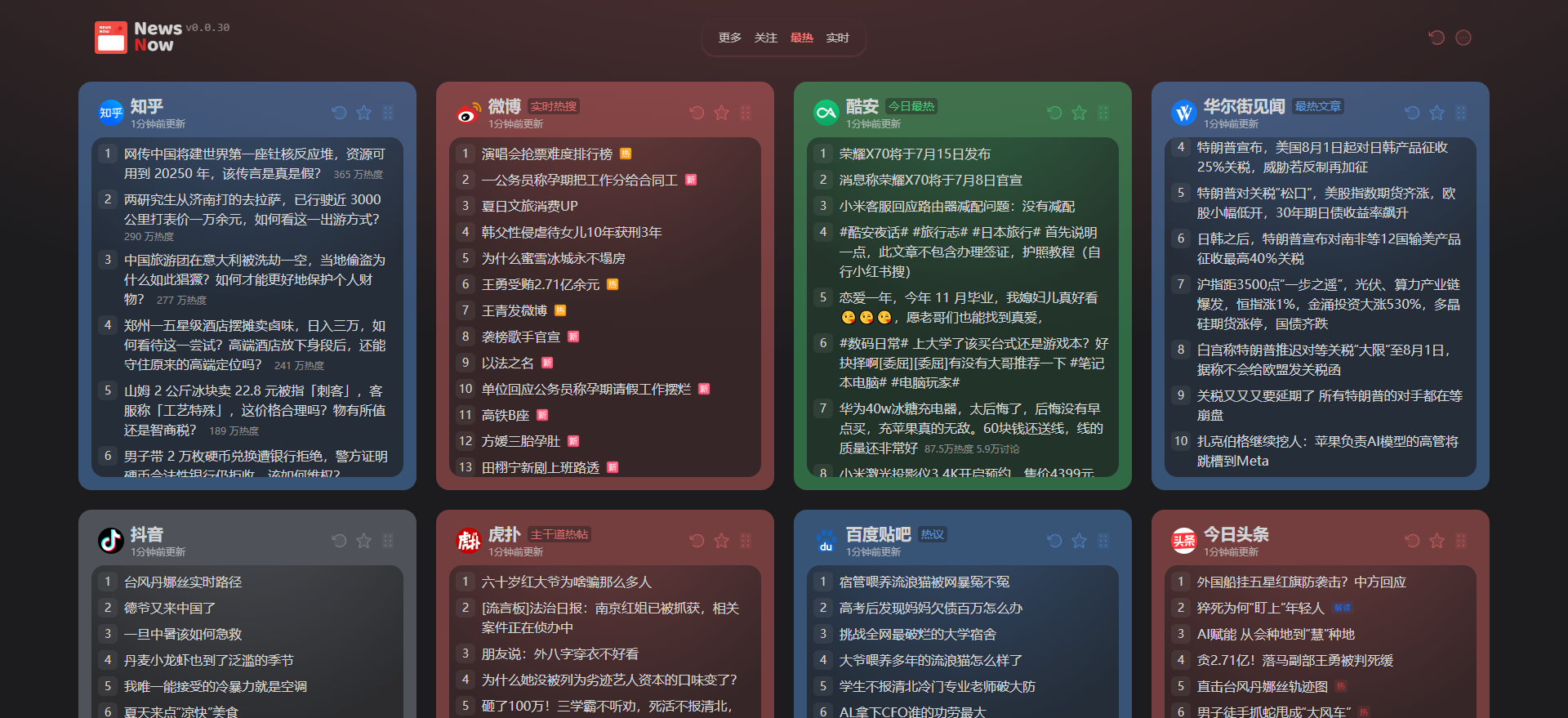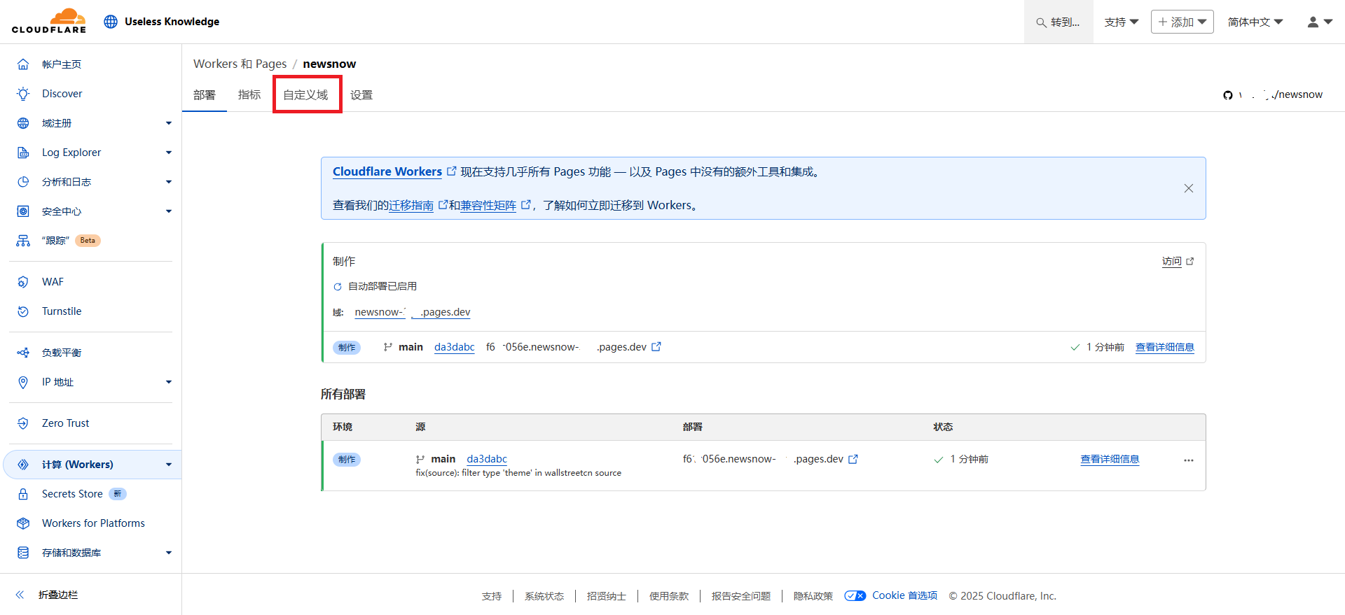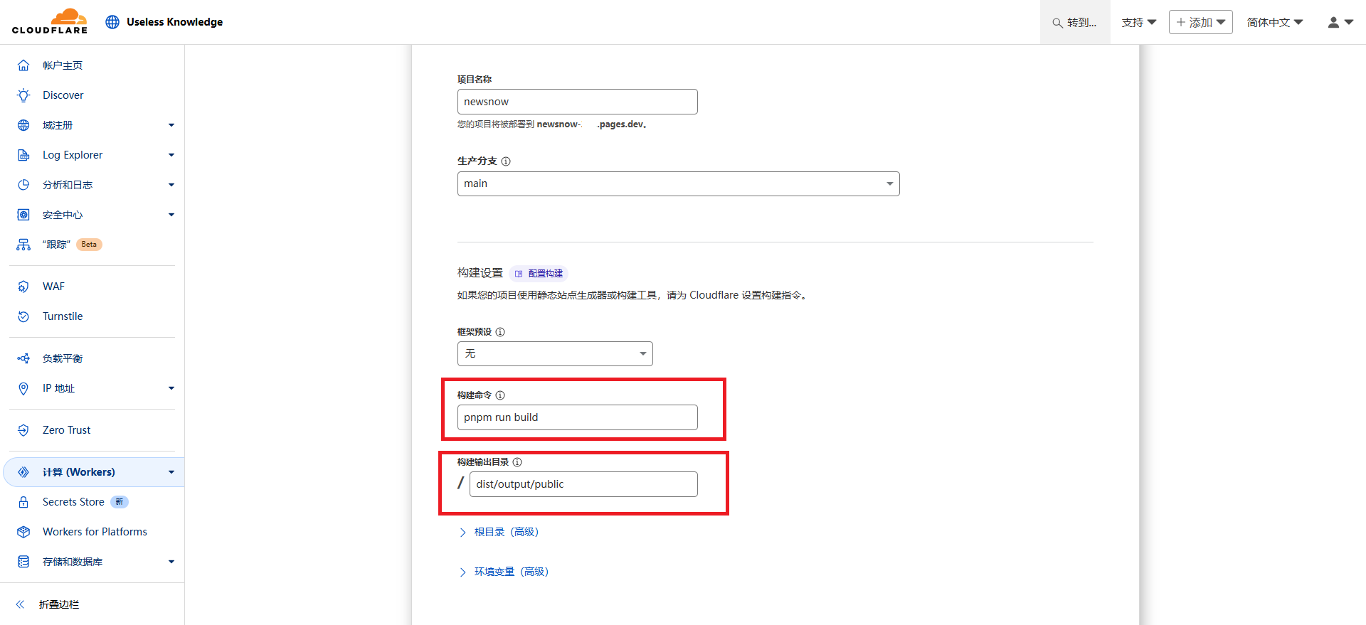 使用 Cloudflare 部署 NewsNow By admin | 2025-07-25 使用 Cloudflare 部署 NewsNowNewsNow是一个开源的实时新闻聚合平台,使用TypeScript开发,能够快速整合来自多个数据源的实时新闻,提供便捷的阅读体验,轻松获取最新的热门资讯。 部署 先给作者点上一颗星星,然后【Fork】项目到自己的仓库,项目名称不变。【Workers 和 Pages】→【创建】→【Pages】→【导入现有 Git 存储库】→【newsnow】→【开始设置】→ 填入参数 →【保存并部署】注意构建配置参数 构建命令:pnpm run build输出目录:dist/output/public 等待部署成功后选择【继续处理项目】给项目添加自定义域。项目部署完成,默认每30分钟抓取新的内容。