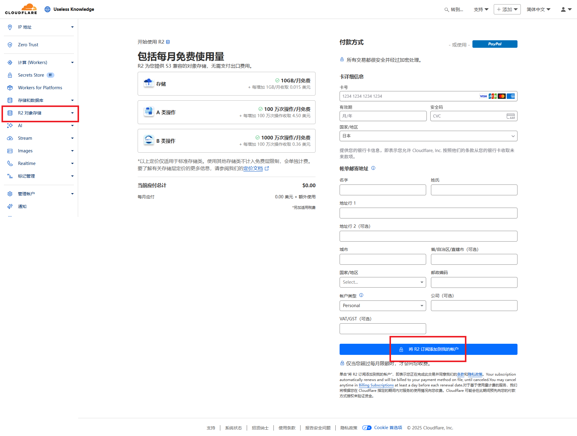 - 【R2 对象存储】,绑定信用卡。