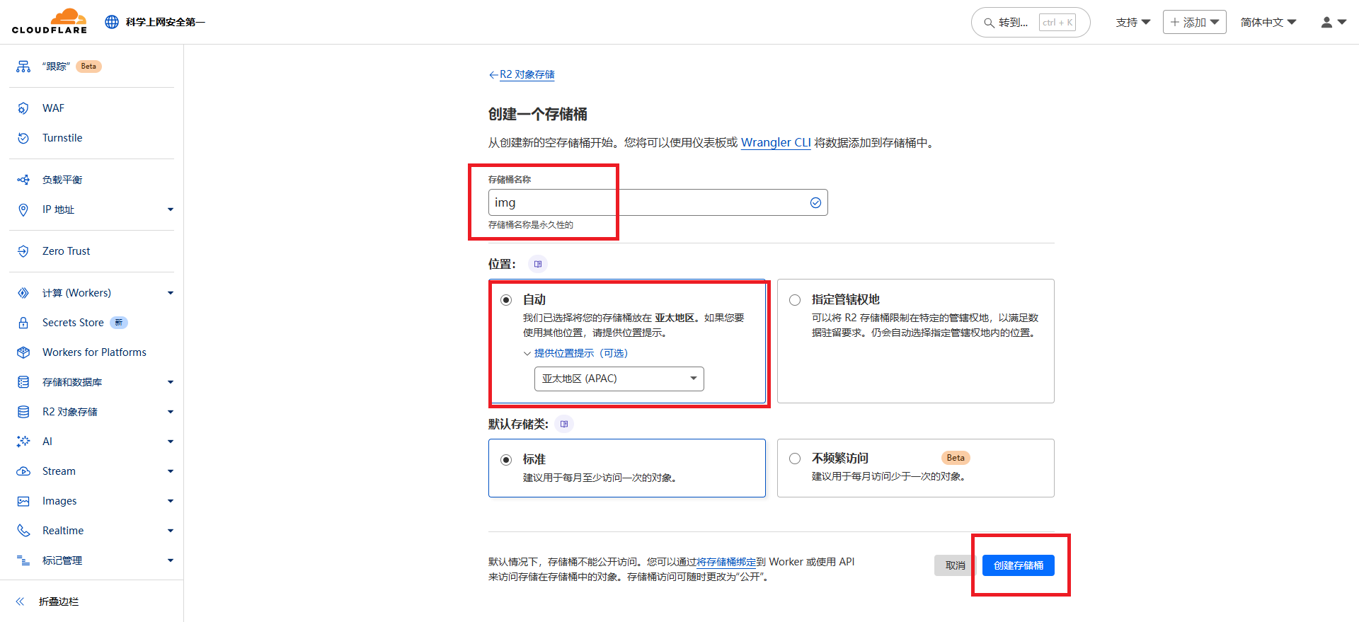 - 选择【存储桶】名称 → 自定义,【位置】→ 【亚太地区】→ 【创建存储桶】