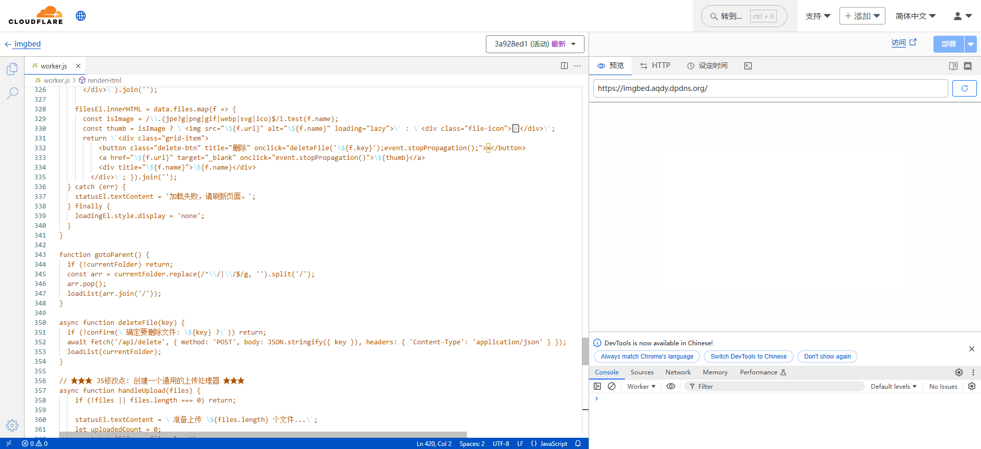 - 打开【workers.js】复制代码,替换刚创建项目默认代码 →【部署】