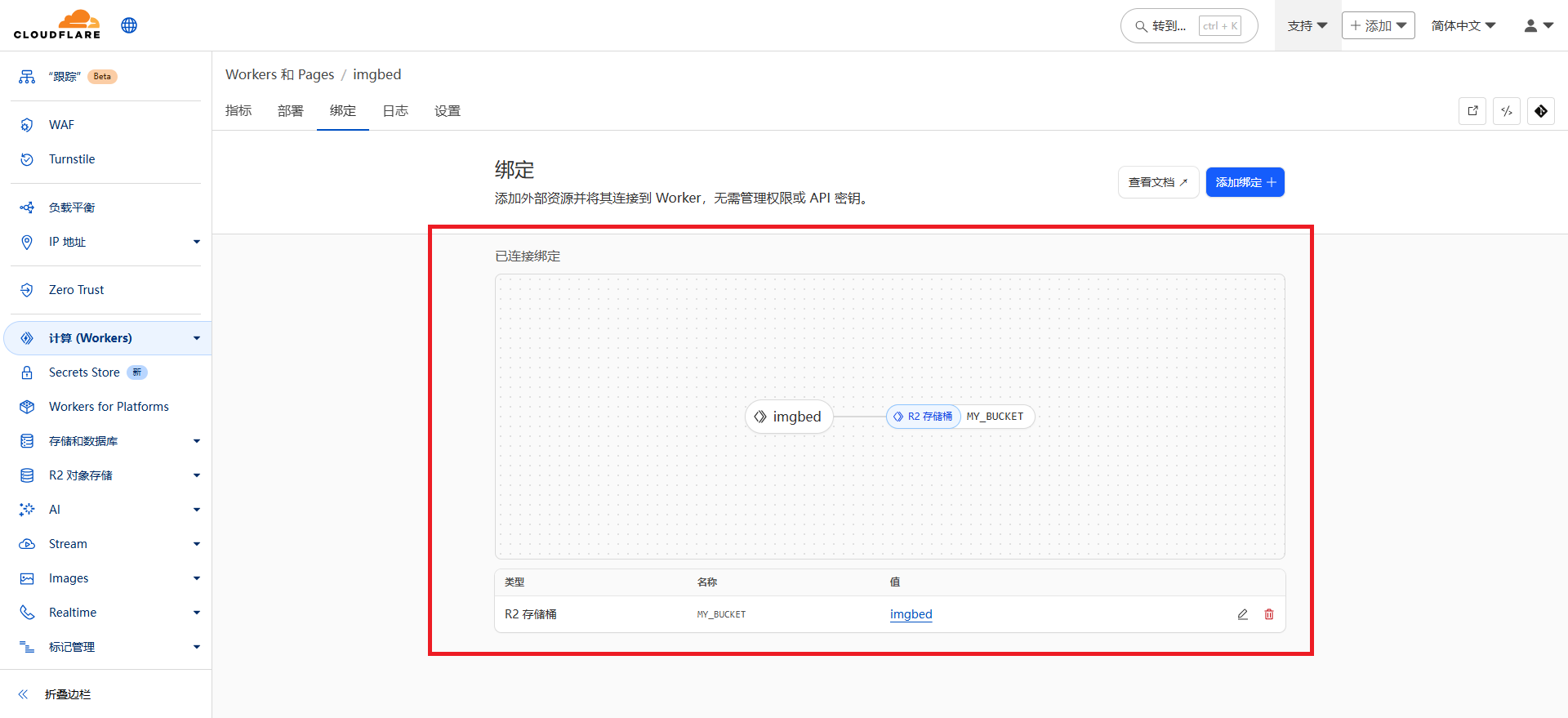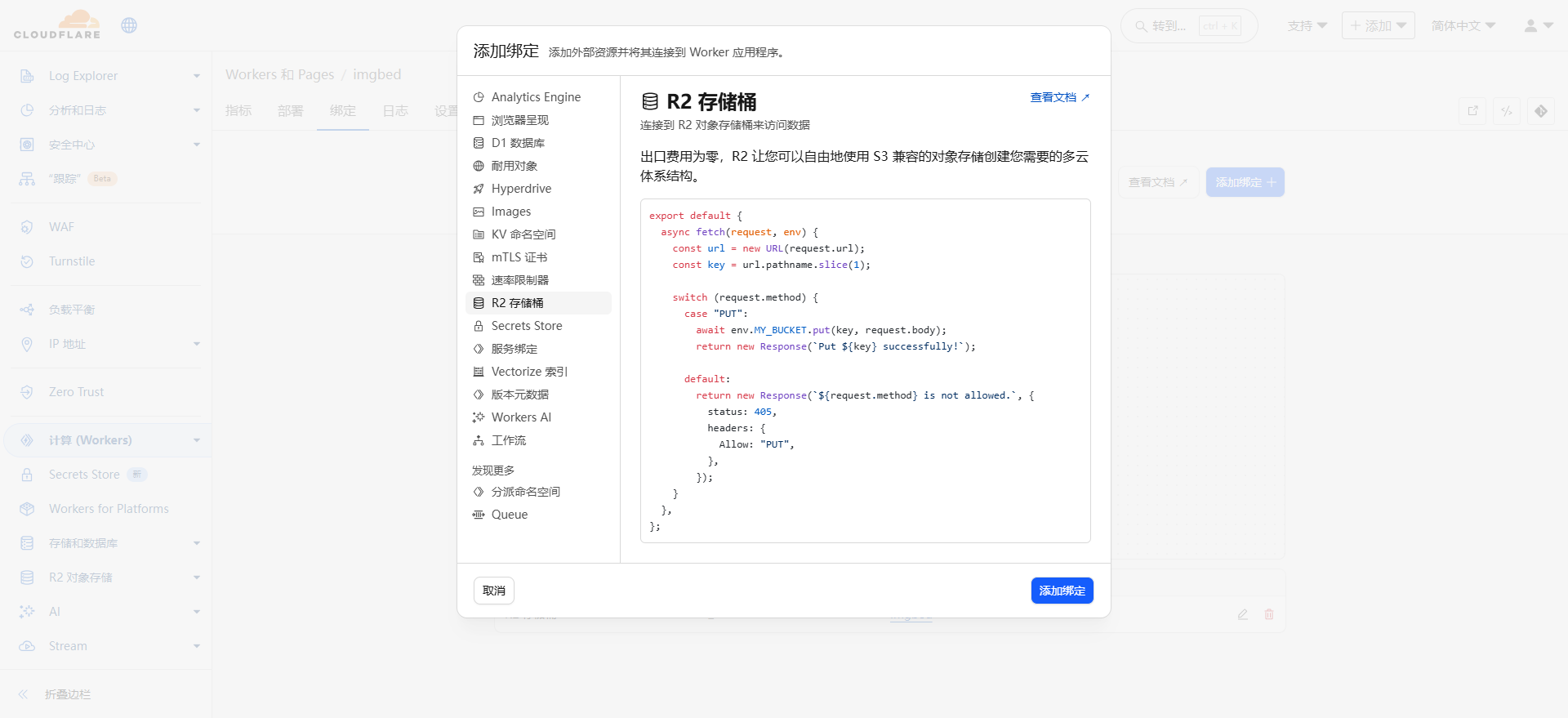 - 返回项目→【绑定】→【添加绑定】→【R2 存储桶】→【添加绑定】