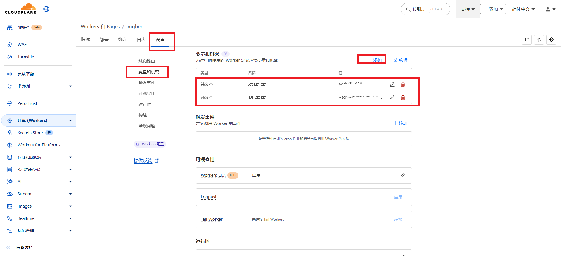 - 【变量名称】MY_BUCKET→【值】选择刚创建的存储桶 →【保存】