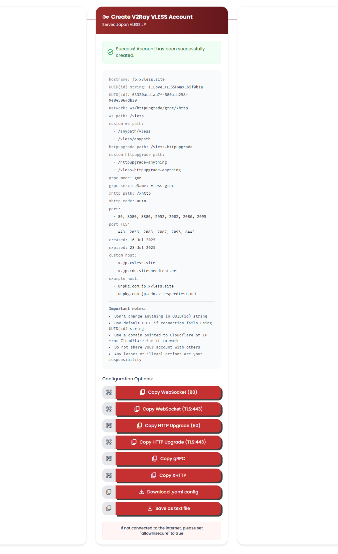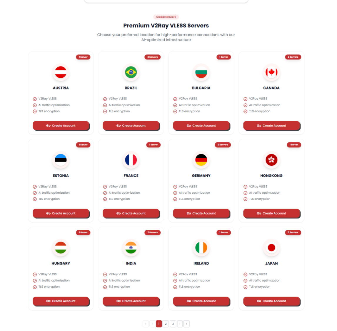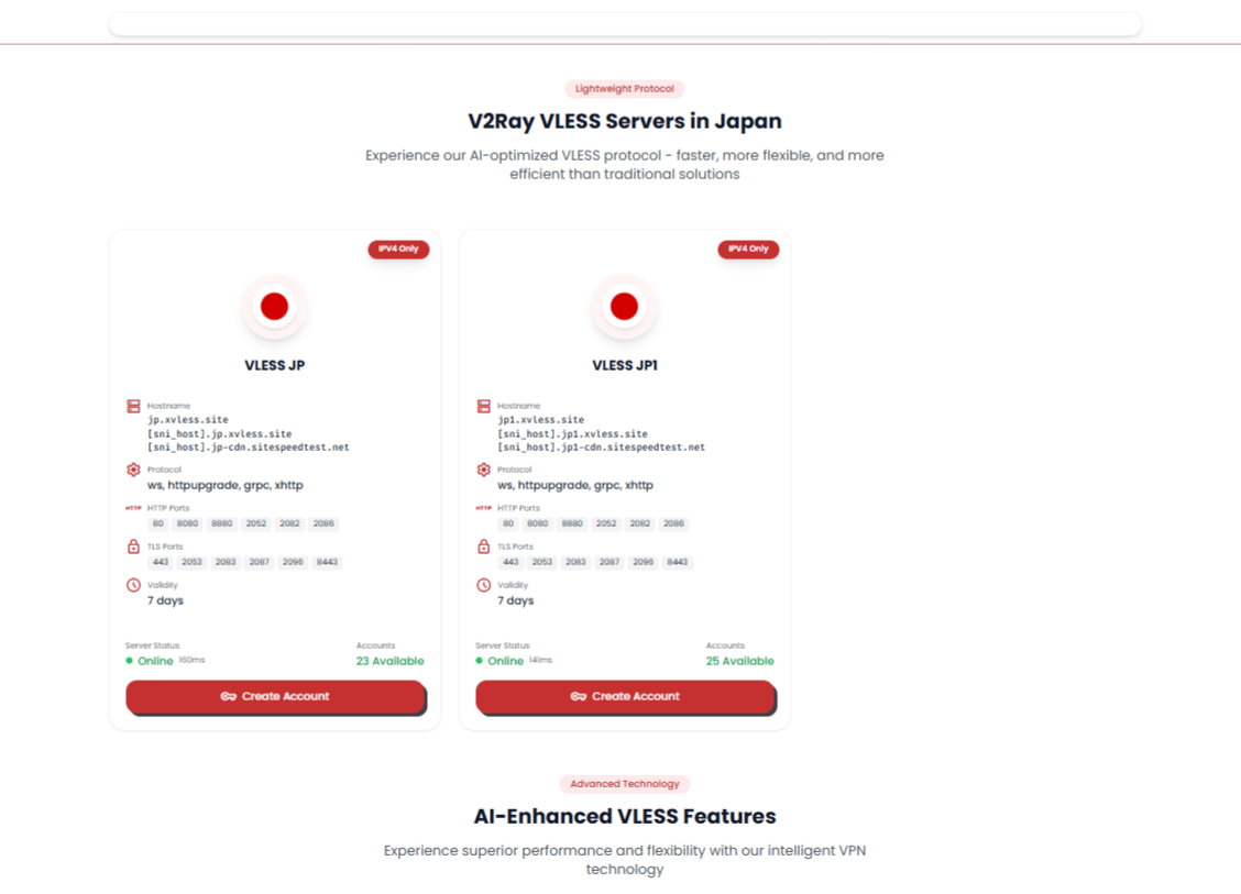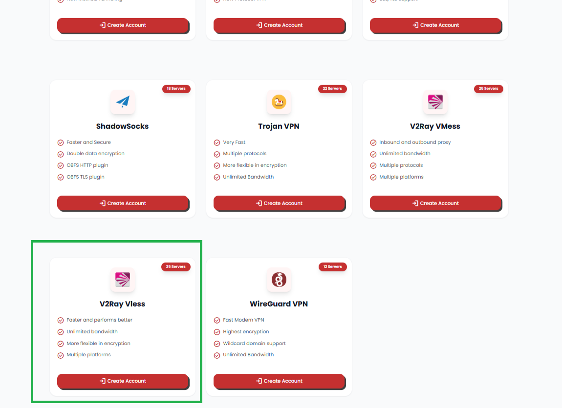 登陆 SSHMax 官网 ,下拉找到【v2Ray Vless】单击【Create Account】继续。