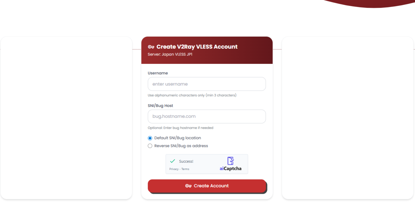 Username - 自定义填写、SNI/Bug Host - 保持默认,点击【Create Account】继续。