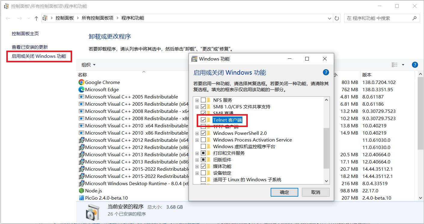 - 开启【Telent 客户端】功能:【设置】→【应用】→【程序和功能】→【启动或关闭 windows 功能】→【Telnet 客户端】。