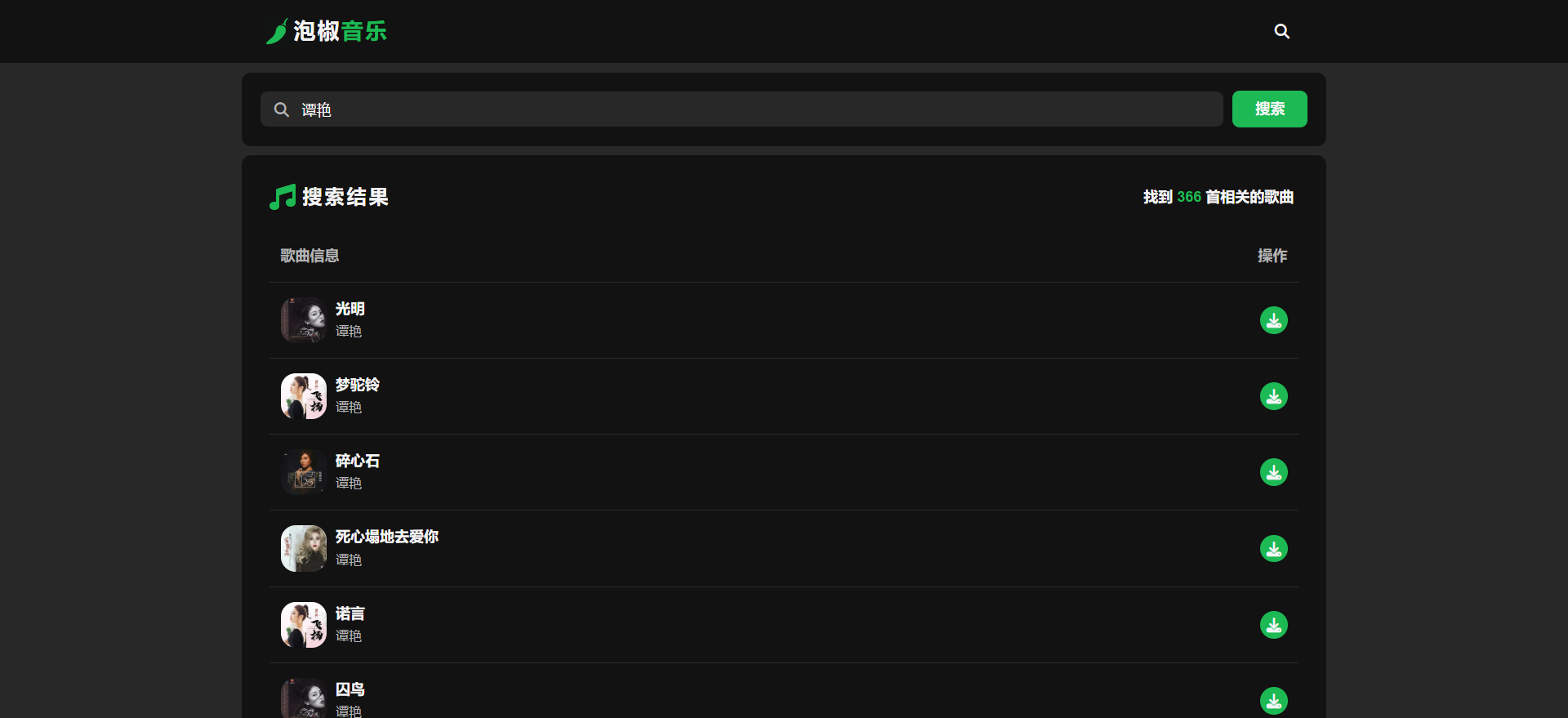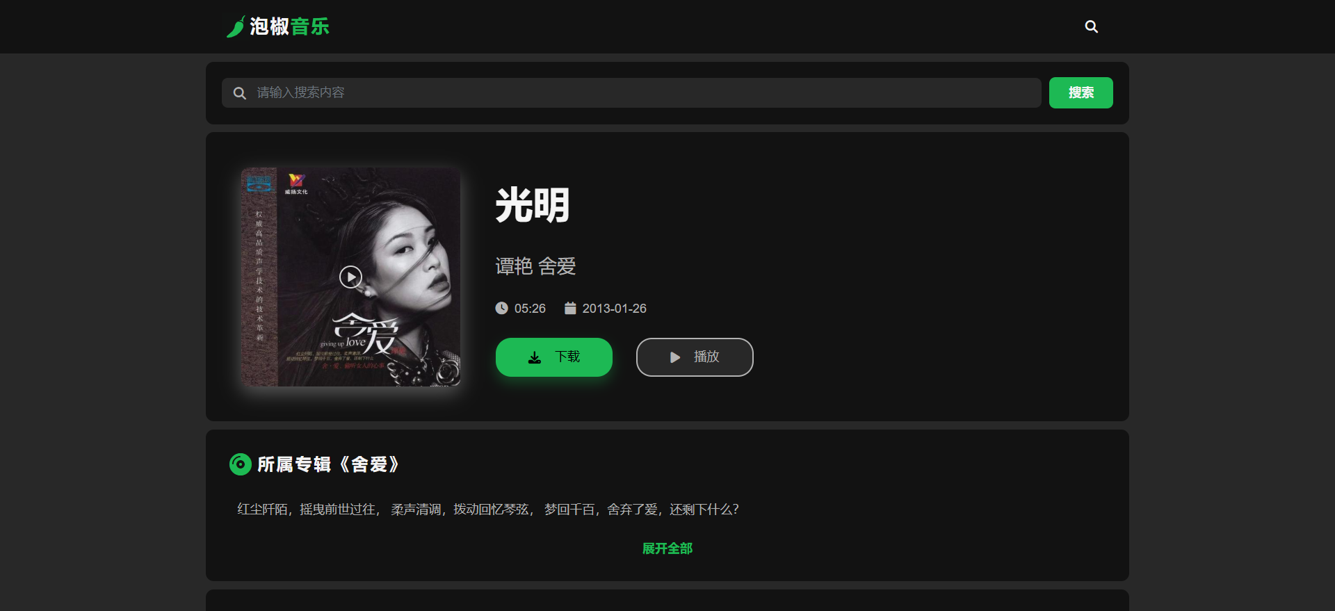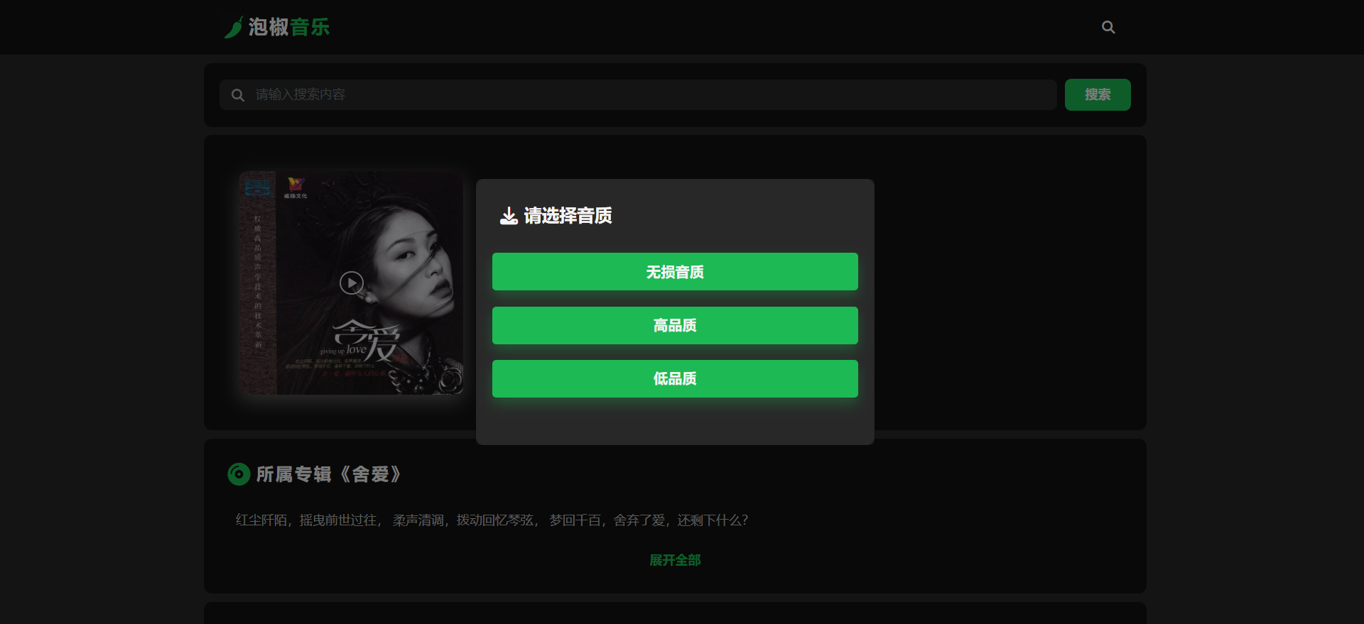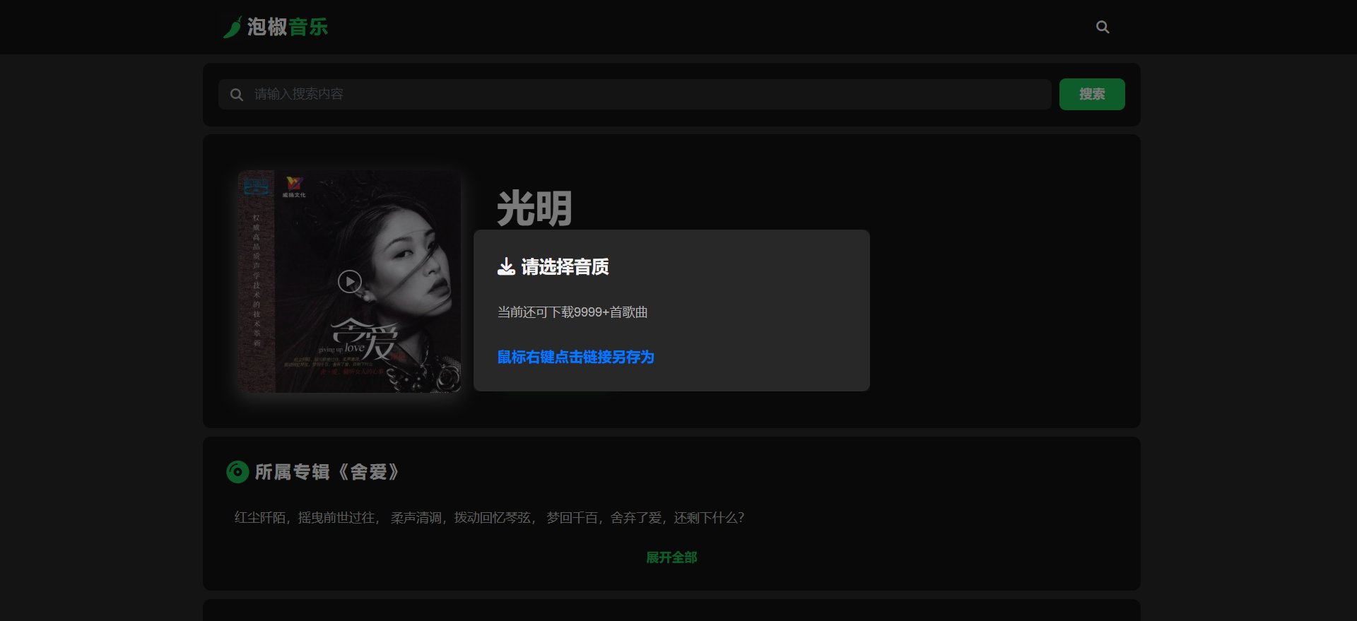 MP3免费下载 By admin | 2025-08-10 真正免费下载泡椒音乐 已知最简单的音乐下载站。 网站简洁明了,直接在搜索栏输入想搜索的歌手或歌曲名,搜索即可。 很快就会显示搜索结果 选择歌曲打开信息页,除了下载和播放功能,还有歌曲所在专辑和歌词。 选择下载弹出音质选择页。 点击【鼠标右键点击链接另存为】即可下载。 推荐选择高品质音质