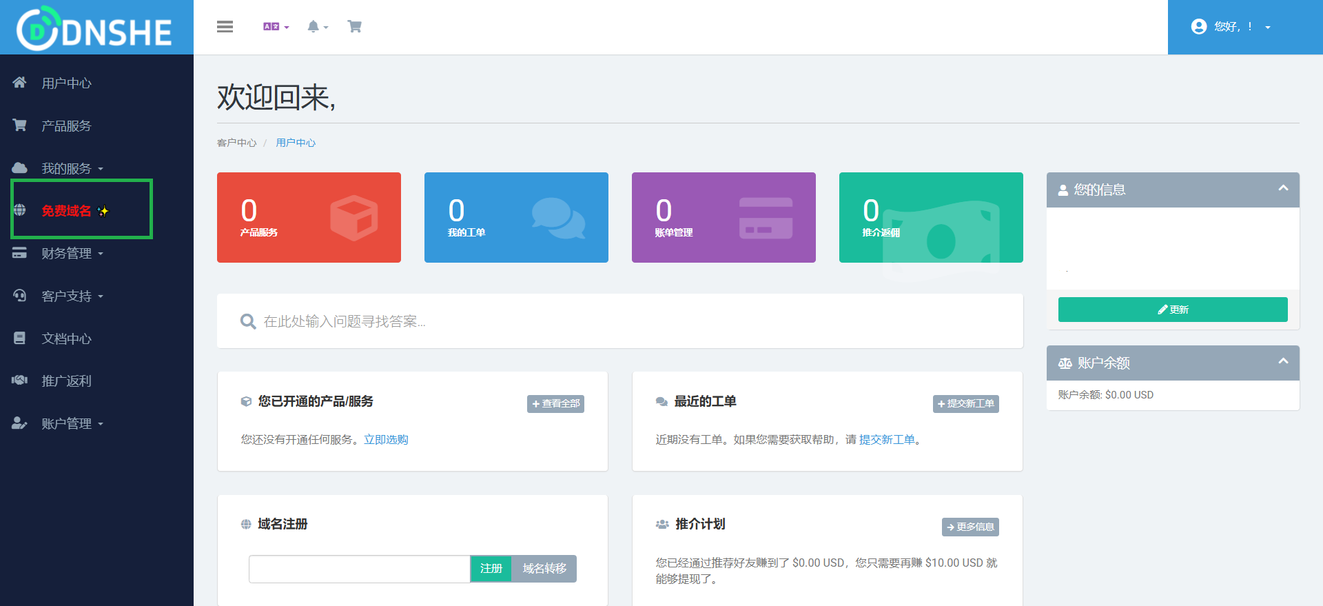 - 推荐使用 Gmail 邮箱注册账号(验证码邮件在垃圾邮件内),注册成功来到【免费域名】页面,选择域名注册【注册】。