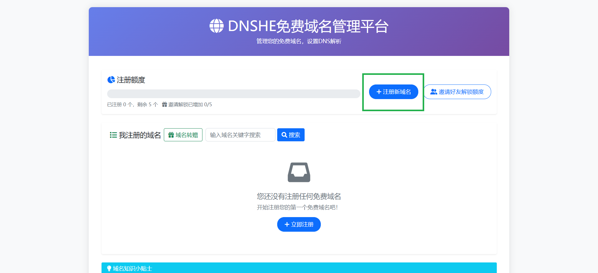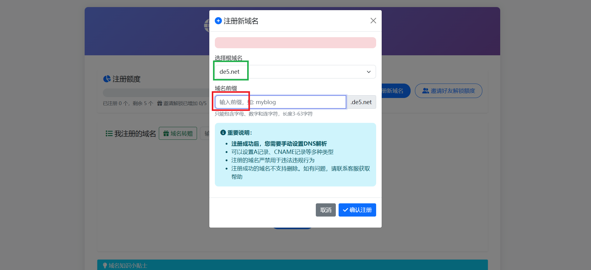 DNSHE 提供多个域名后缀,包括 de5.net/.us.ci/.cc.cd ,其中 .de5.net 后缀支持托管至 CloudFlare 。