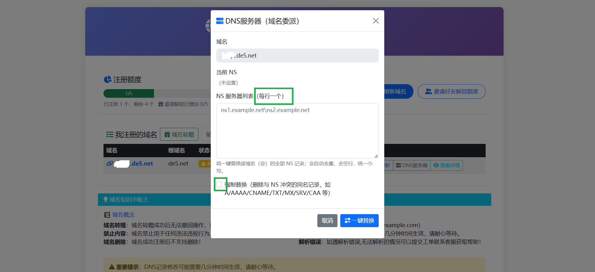 - 选择【添加解析】,将 Cloudflare 提供的 DNS 填入【NS 服务器列表】,勾选【强制替换】→【一键替换】。