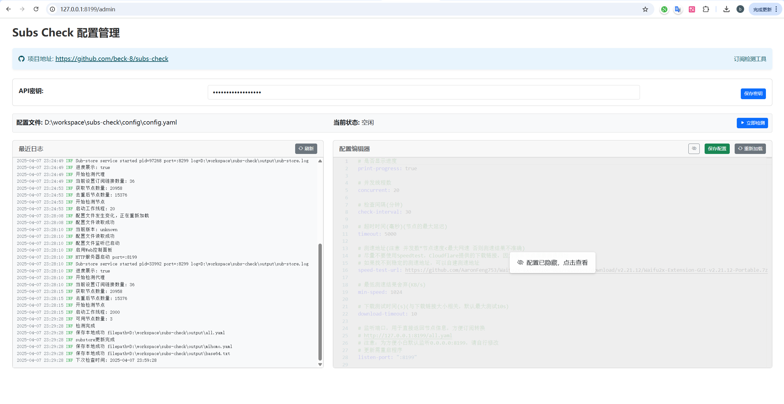 - 下载执行 subs-check 文件,首次运行会自动完成本地化配置;再次运行 subs-check 文件,记录随机生成的 api-key 值。